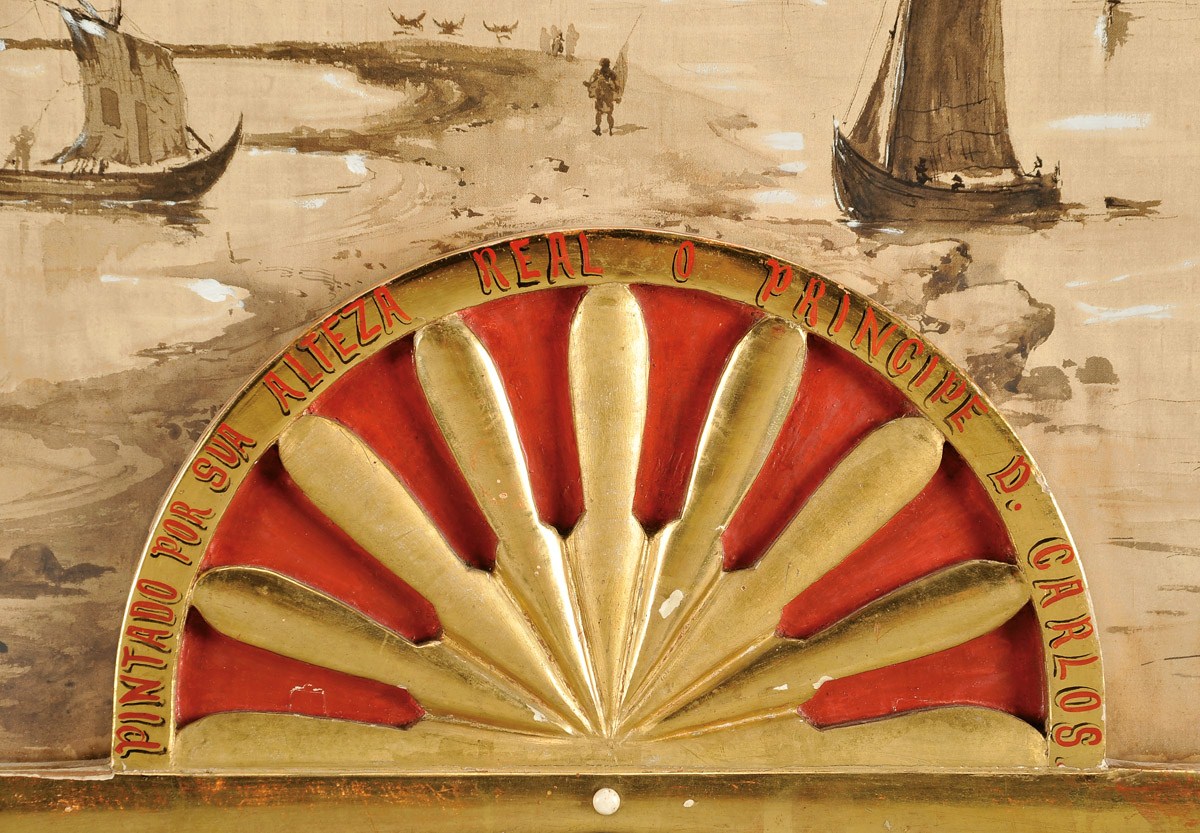 - moldura em forma de leque com inscrição manuscrita "Pintado por sua Alteza Real o Príncipe D. Carlos"