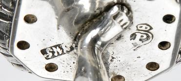 - decoração relevada e gravada, marca de ensaiador do Porto (1853-1861), marca de ourives de GGM (1843-1861)