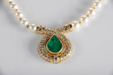 - fiada de pérolas de cultura (9 mm) intercaladas por anilhas e pendente em ouro (18 kt.) cravejado com esmeralda em talhe gota e 18 diamantes em talhe baguette com o peso aproximado de 1,70 ct. e cerca de 110 em talhe de brilhante com o peso aproximado de