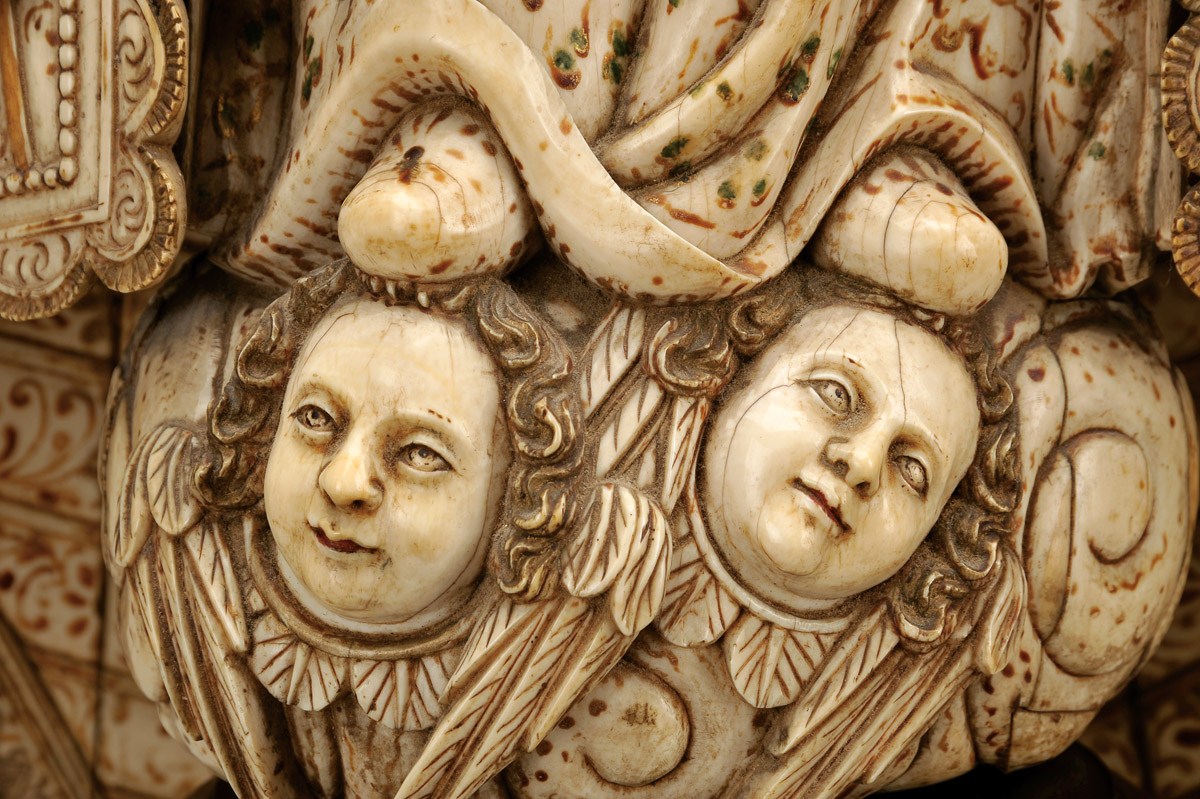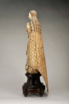 large dimensions mantle made by the assemblage of several ivory plaques with wooden interior, Hispano-Philipine, 17th C., one finger missing, small flaws to the mantle, wear signs to the gilt and to the polychomy, unoriginal Brasilian rosewood base with carvings,