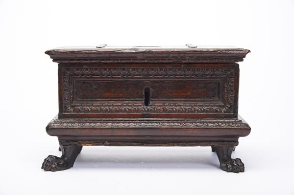 - frisos entalhadas, frente e laterais com frisos relevados, pés zoomorficos, ferragens em ferro