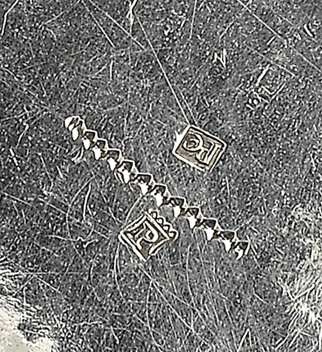 - decoração gravada "Folhagens" e relevada "Concheados", marca de ensaiador do Porto (1784-1792), marca de ourives de João Rodrigues da Costa Negreiros (1756-1811)