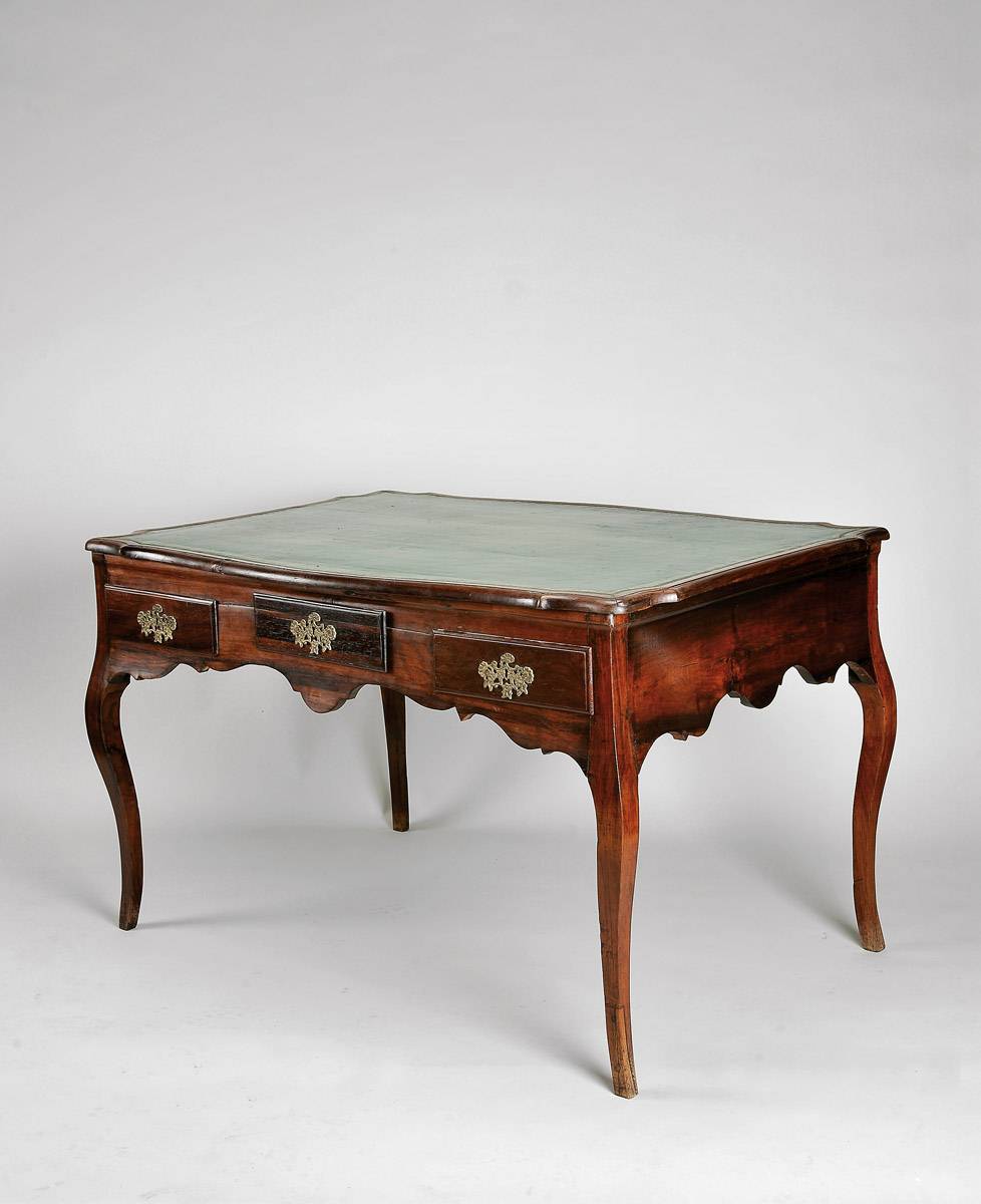 - gavetas de ambos os lado, tampo revestido a couro verde com ferros a ouro, ferragens em bronze