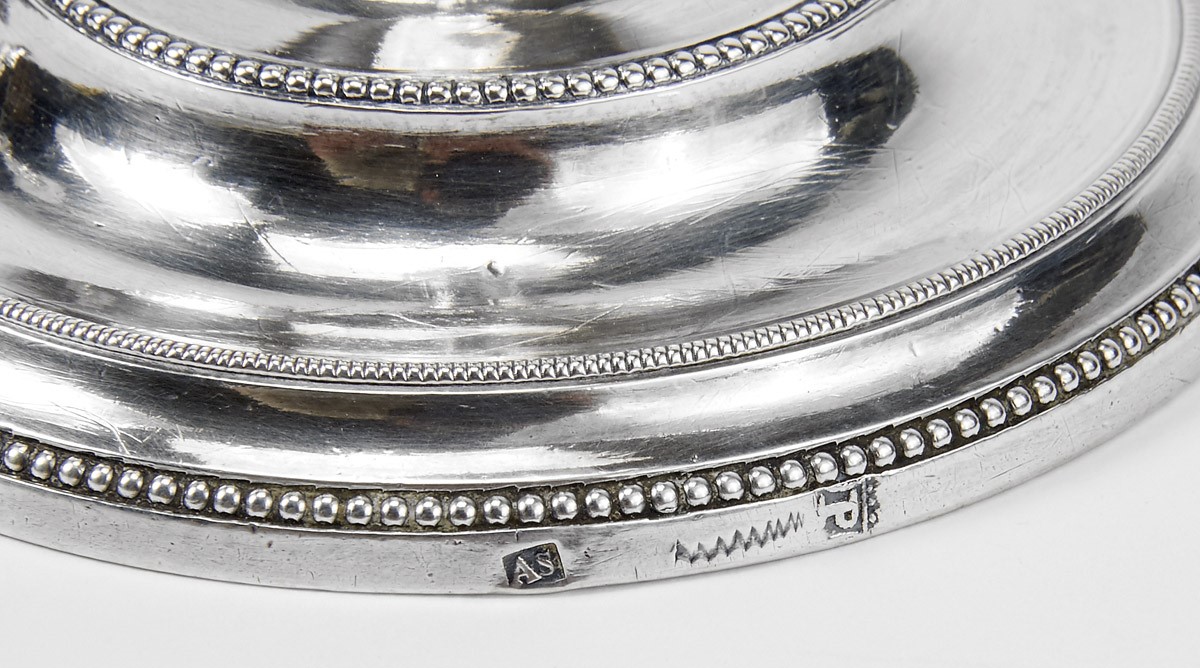 - decoração gravada, perlada e canelada, marca de ensaiador do Porto (1784-1792), marca de ourives de António de Sousa (1768-1810)