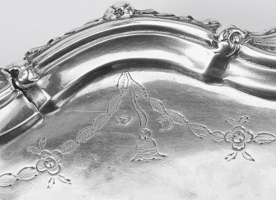 - decoração relevada "Concheados", fundo gravado "Grinaldas", marca de ensaidor do Porto (1784-1792), marca de ourives de AD (1768-1804)