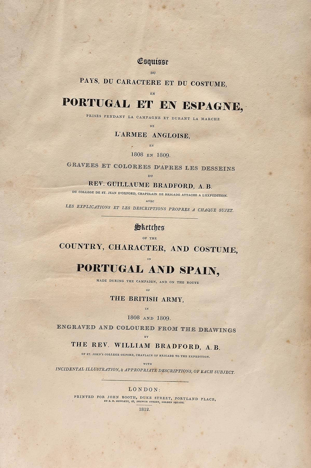 - en 1808 en [sic] 1809. / Gravees et colorees d’apres les desseins du Rev. Guillaume Bradford [...] avec les explications et les descriptions propres a chaque sujet. = Sketches of the country, character and costume, in Portugal and Spain, made during the campaign, and on the route of the British Army, in 1808 and 1809. / Engraved and coloured from drawings by the Rev. William Bradford [...] with incidental illustrations, & appropriate descriptions, of each subject.- London: printed for John Booth, 1812.- [4, 38] f.: [40 (aliás 34)] gravuras coloridas; 47 cm. Junto com:
