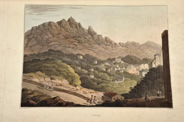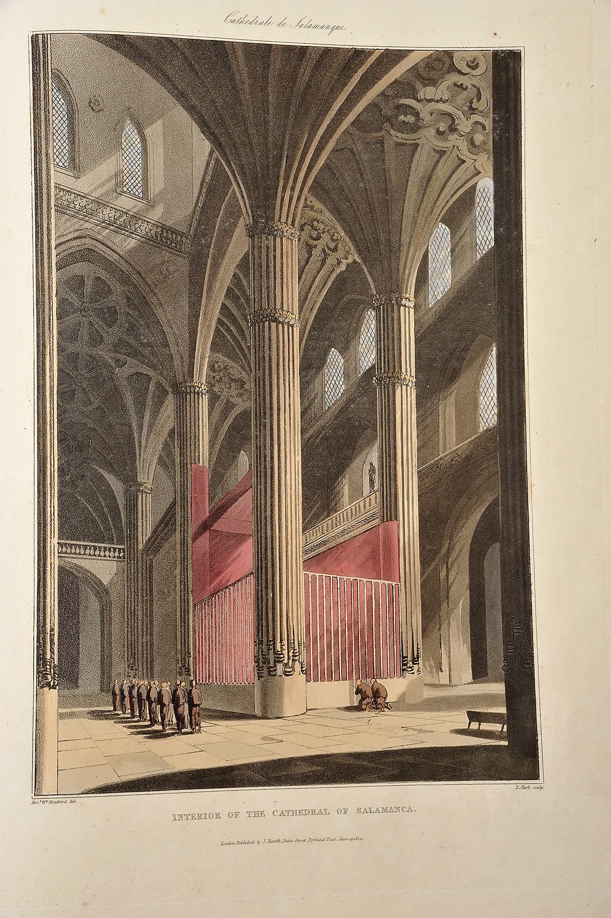 -----.- Revue historique et chronologique des evenements memorables de la Guerra dans la Peninsule [...] compilee et redigee pur servir de suplement aux esquisses du pays, costumes, &c. par Rev. Guillaume Bradford. = Chronological and historical restrospect of the memorable events of the War in the Peninsula [...] collected and anexed as a supplemental addition to the Rev. William Bradford’s views, &c.- London: printed for John Booth, 18123.- [2], 24 p.: [13 (aliás 12)] gravuras coloridas; 47 cm.- E. Variantes da obra de Bradford, com data de 1812 na primeira parte e de 1813 na segunda. Todos os textos são bilingues em francês (primeiro) e em inglês (depois). Exemplar de trabalho, completo de texto e com margens muito generosas, mas com falta de seis gravuras na primeira parte: 1 – Creek of Maceira; 6 – Cintra from the Lisbon road; 9 – Aqueduct of Alcantara; 15 – View of the Tagus near Villa Velha; 20 – The Boleras Dance; 21 – Salamanca. Na segunda parte falta apenas a gravura 13 e última: French Dragoon. A maioria das páginas de texto apresentam picos de acidez e manchas de humidade, por vezes fortes. As gravuras encontram-se em geral bastante limpas. Meia-encadernação de pele, da época, cansada (mas recuperável), com um grande rótulo em pele na pasta superior, solta. A gravura 32 (Toro) é de uma variante diferente da que se encontra no lote XXXXX, com o mesmo número. O rosto e respectivo texto da segunda parte (Revue historique et chronologique...), encontram-se encadernados no início do volume. Tooley, 108 e 109.