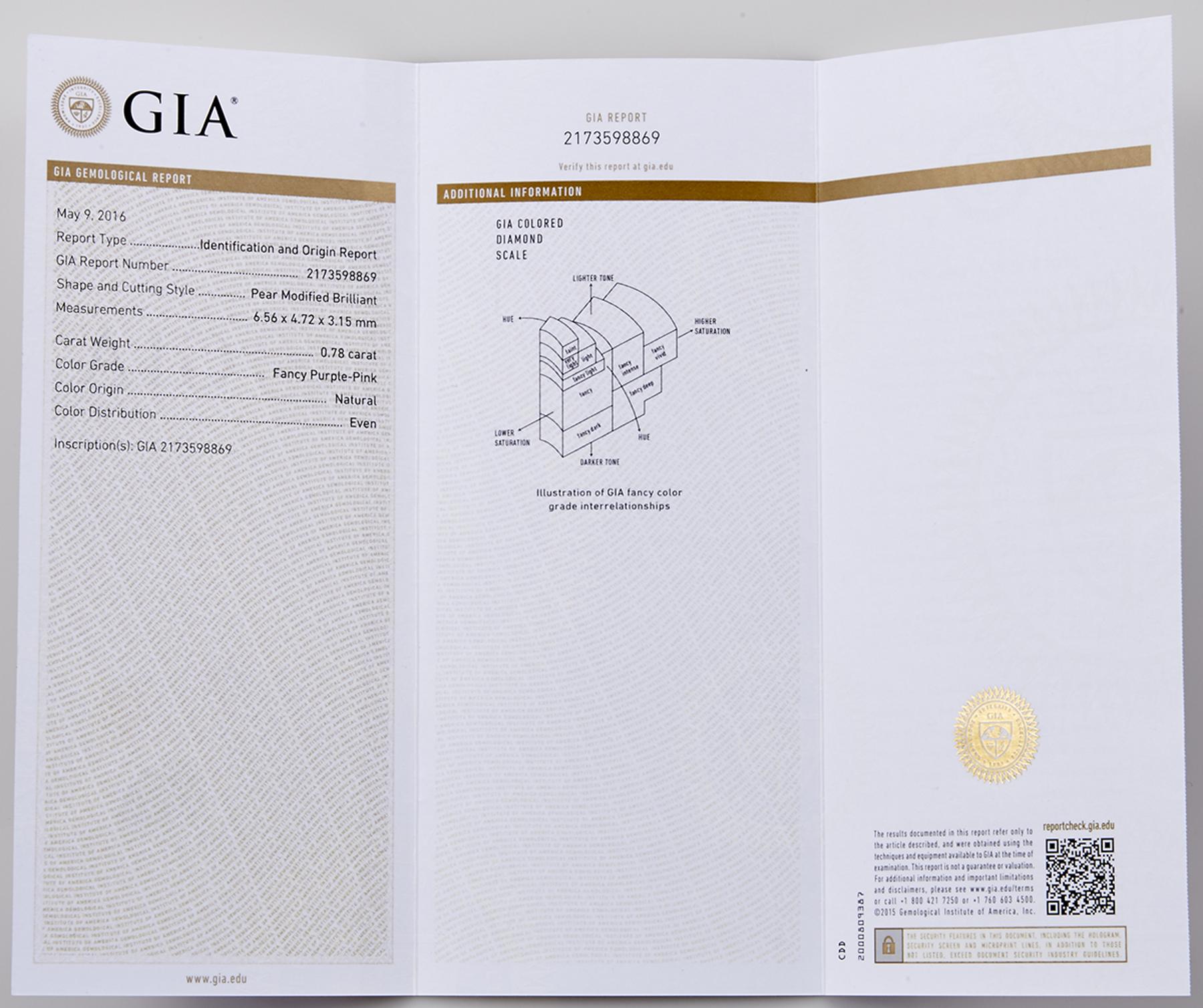 - cravejado com 17 diamantes incolores com o peso aproximado de 0,25 ct. e diamante de tom rosa em talhe gota com o peso de 0,78 ct.