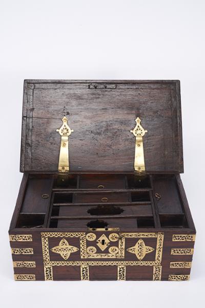 - aplicações e pegas em metal amarelo recortado e vazado, interior compartimentado