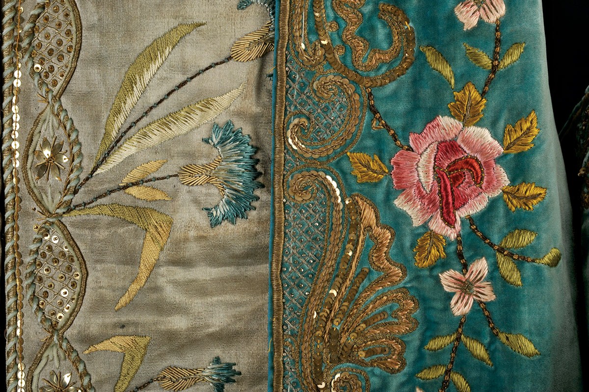 - veludo bordado a fio de prata, fio de seda policromado "Flores", lantejoulas e missangas, botões com strass