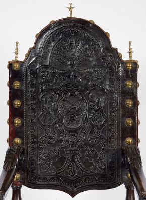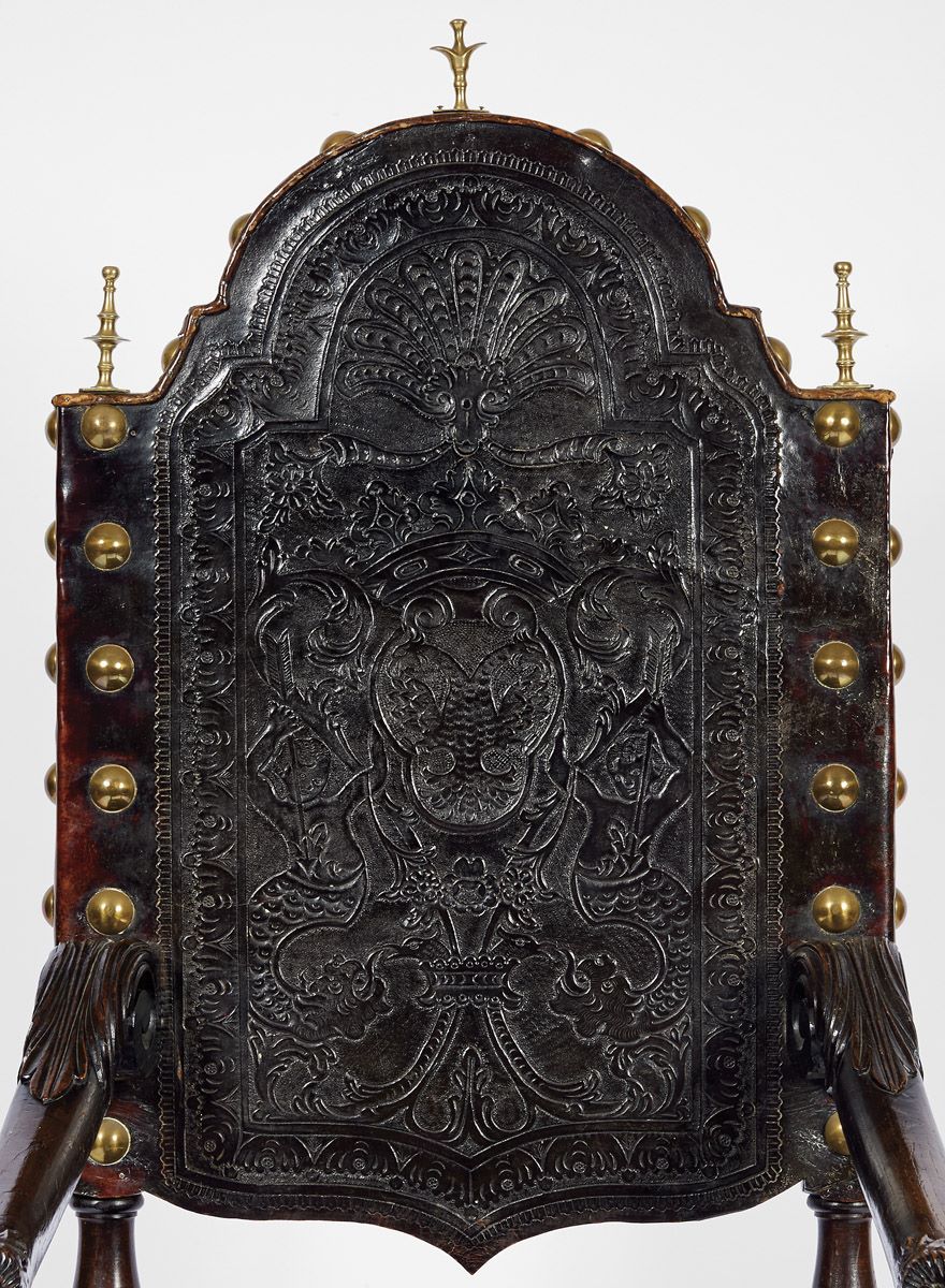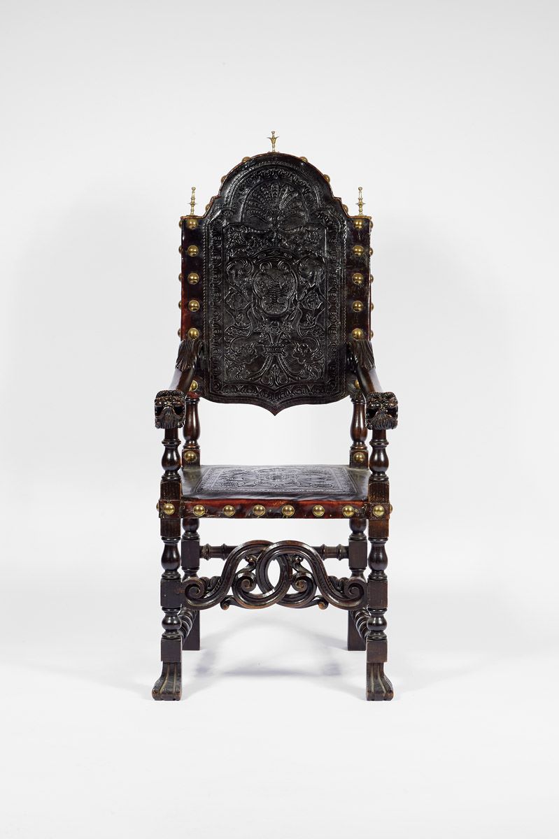 - pés de vassoura, assento e costas em couro lavrado com pregaria