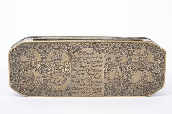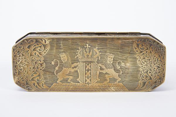 - decoração gravada "Fé, Esperança, Caridade, Fortuna, Liberalidade, Imortalidade, Justiça e Temperança", "Armas da cidade de Amesterdão", "Motivos vegetalistas", inscrição em holandês e iniciais JFP