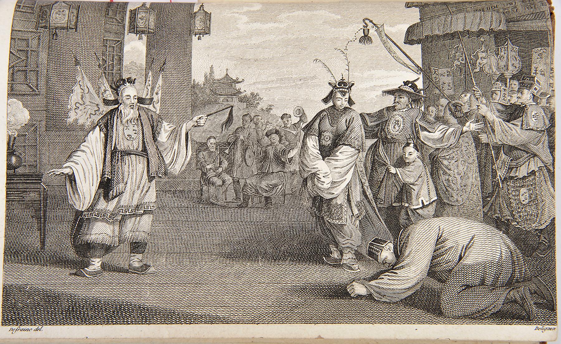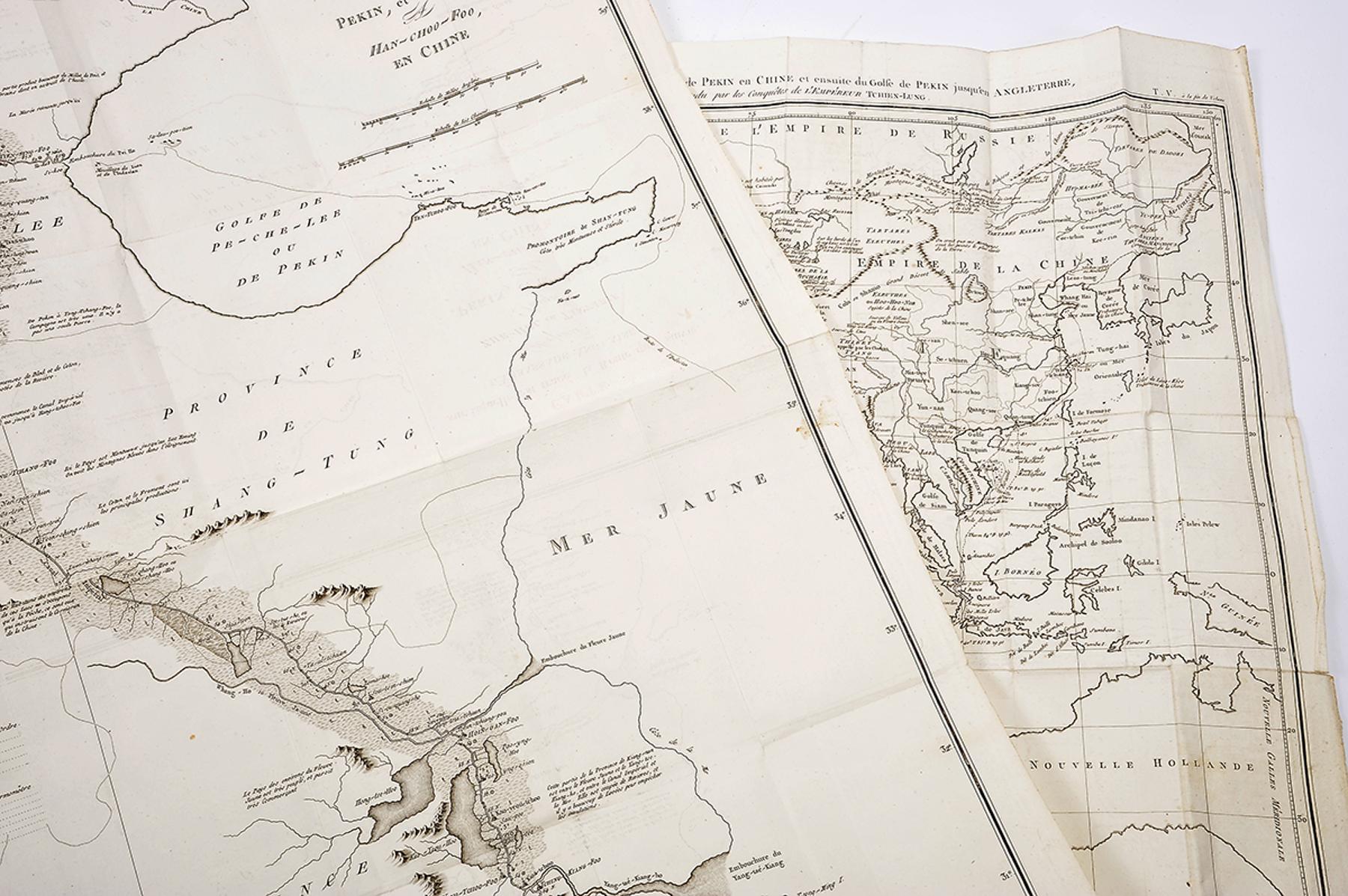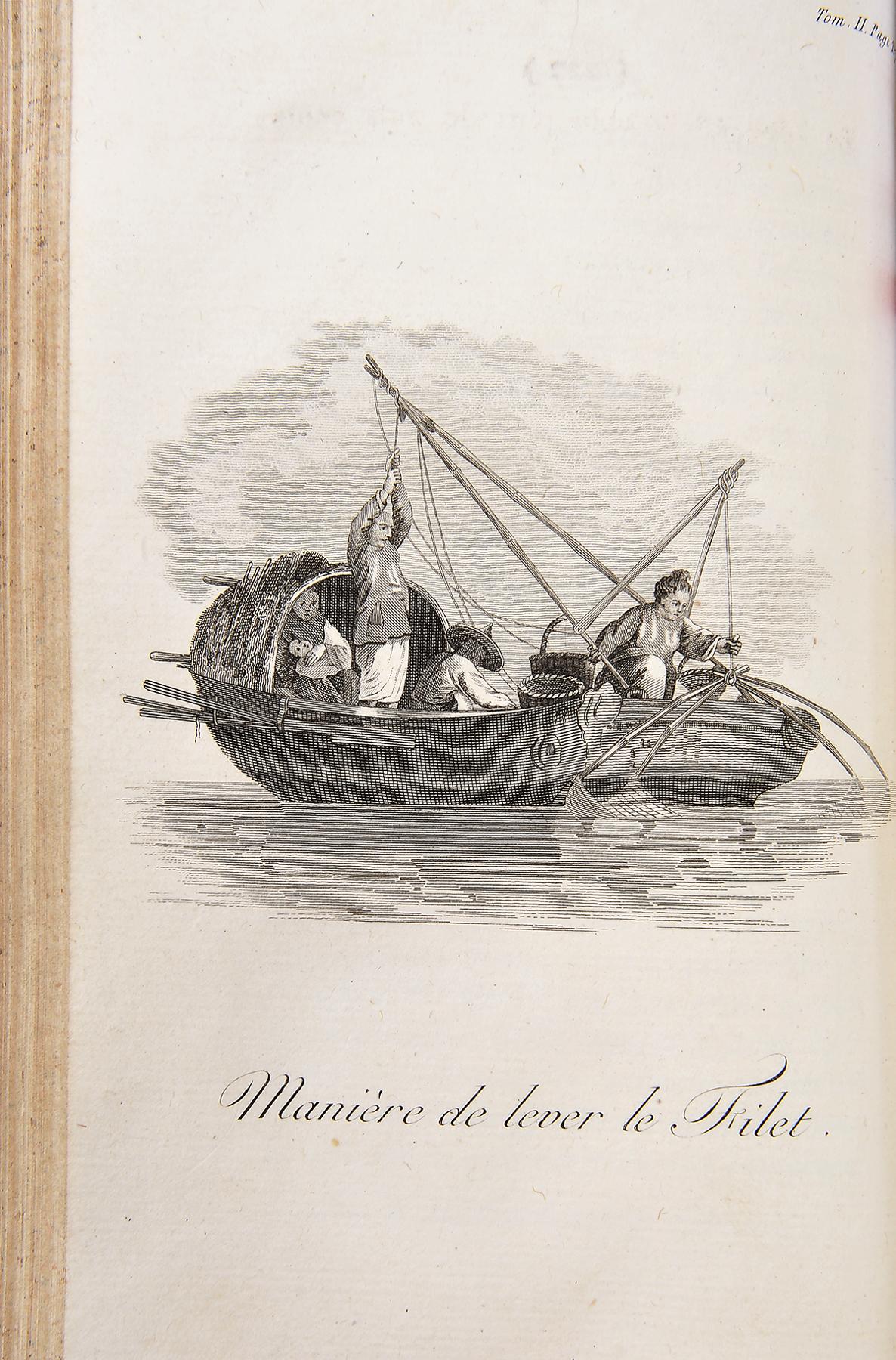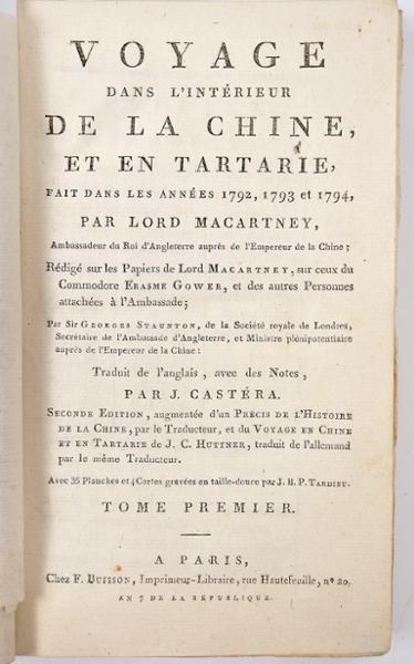 - MACARTNEY, Lord.- Voyage dans l’intérieur de la Chine et en Tartarie, fait dans les années 1792, 1793 et 1794... / rédigé sur les papier de Lord Macartney, sur ceux du Commodore Erasme Gower, et des autres personnes attachés à l’Ambassade, par Sir Georges Staunton; traduit de l’anglais, avec des notes, par J. Castéra.- Seconde édition, augmentée d’un précis de l’histoire de la Chine, par le traducteur, et du voyage en Chine et en Tartarie de J. C. Huttner...- A Paris: Chez F. Buisson, An 7 (1799).- 5 vols.: il.; 20 cm.- E. Georges Macartney (1737-1806), estadista britânico, governador colonial e diplomata, chefiou a embaixada à China com o objectivo de estabelecer relações comerciais com este país. Segunda edição do relato da sua viagem, muito aumentada, sobretudo nas ilustrações, tendo a primeira sido publicada apenas no ano anterior. A colação de cada um dos tomos é a seguinte: tome premier: [4], CXXXVI, 311 p.; tome second: [4], 408 p.; tome troisième: [4], 414, [2] p.; tome quatrième: [4], 380 p.; tome cinquième: [4], 350 p. O conjunto dos cinco tomos inclui 39 gravuras, sendo um retrato do autor e um mapa, no primeiro tomo e três grandes mapas desdobráveis no final do quinto tomo. Todas as gravuras, incluindo os mapas estão numeradas de I a XXXIX. Exemplar aparado, por vezes com prejuízo das legendas de algumas gravuras, sobretudo as panorâmicas. Alguns cadernos levemente desconjuntados; mapas finais mal dobrados e um destacado por rasgão, sem falta de suporte. Encontra-se, contudo, completo e limpo. Encadernações da época, inteiras de carneira, um pouco cansadas, mas sólidas.