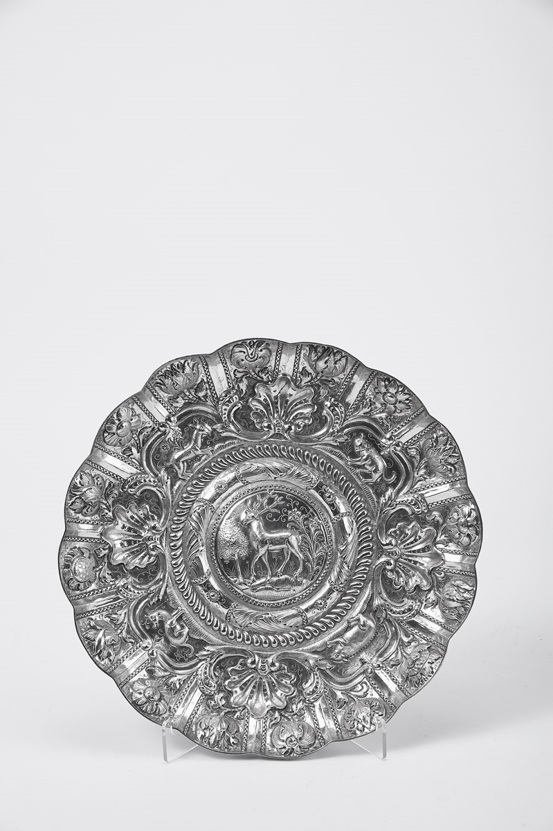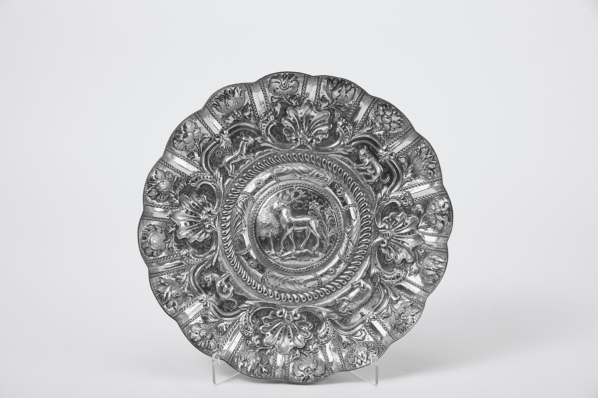 - decoração repuxada e gravada "Flores e animais", medalhão central com reserva "Cervo", marca de ensaiador de Santarém ou Setubal, marca de ourives SC