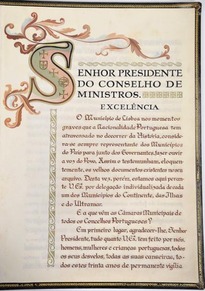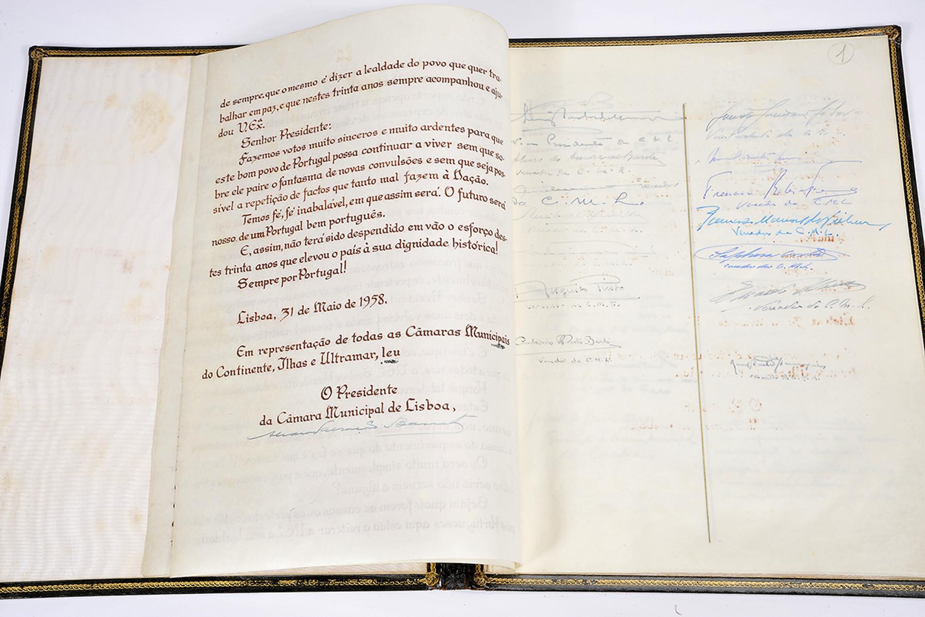 Manuscrito sobre pergaminho, iluminado (na primeira página) e caligrafado. A mensagem, de lealdade e reconhecimento, ocupa as quatro primeiras páginas do documento e é subscrita por Álvaro Salvação Barreto, presidente da Câmara Municipal de Lisboa (1944-1959) «em representação de todas as Câmaras Municipais do Continente, Ilhas e Ultramar». Segue-se uma folha com as assinaturas dos vereadores da Câmara de Lisboa e uma outra com cerca de duas dezenas de assinaturas de outros tantos presidentes de diversos municípios. O conjunto, acompanhado de uma fotografia de Salazar e de um recorte alusivo à entrega do documento, encontra-se revestido de uma encadernação inteira de chagrin negro (assinada Frederico d’Almeida), levemente manuseada, com inscrição a ouro e deoração manuelina no plano superior.