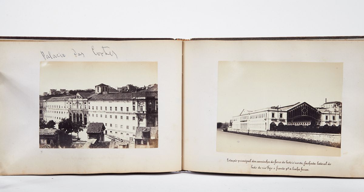 Encadernação da época, inteira de marroquim, com moldura relevada em troncos de madeira, ao gosto da época romântica; apresenta no plano superior a inscrição: PORTUGAL - ALBUM - 1867; no plano inferior, ao centro, as iniciais A. F.