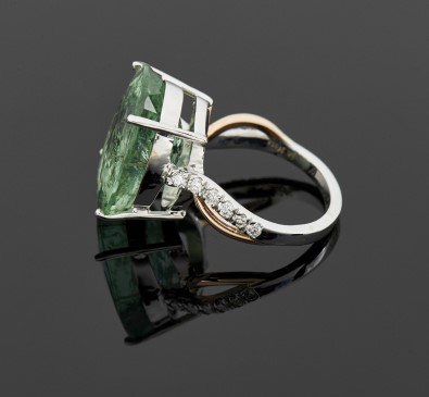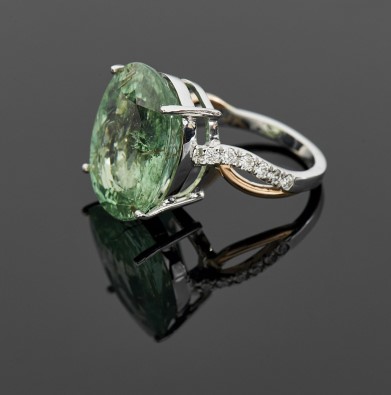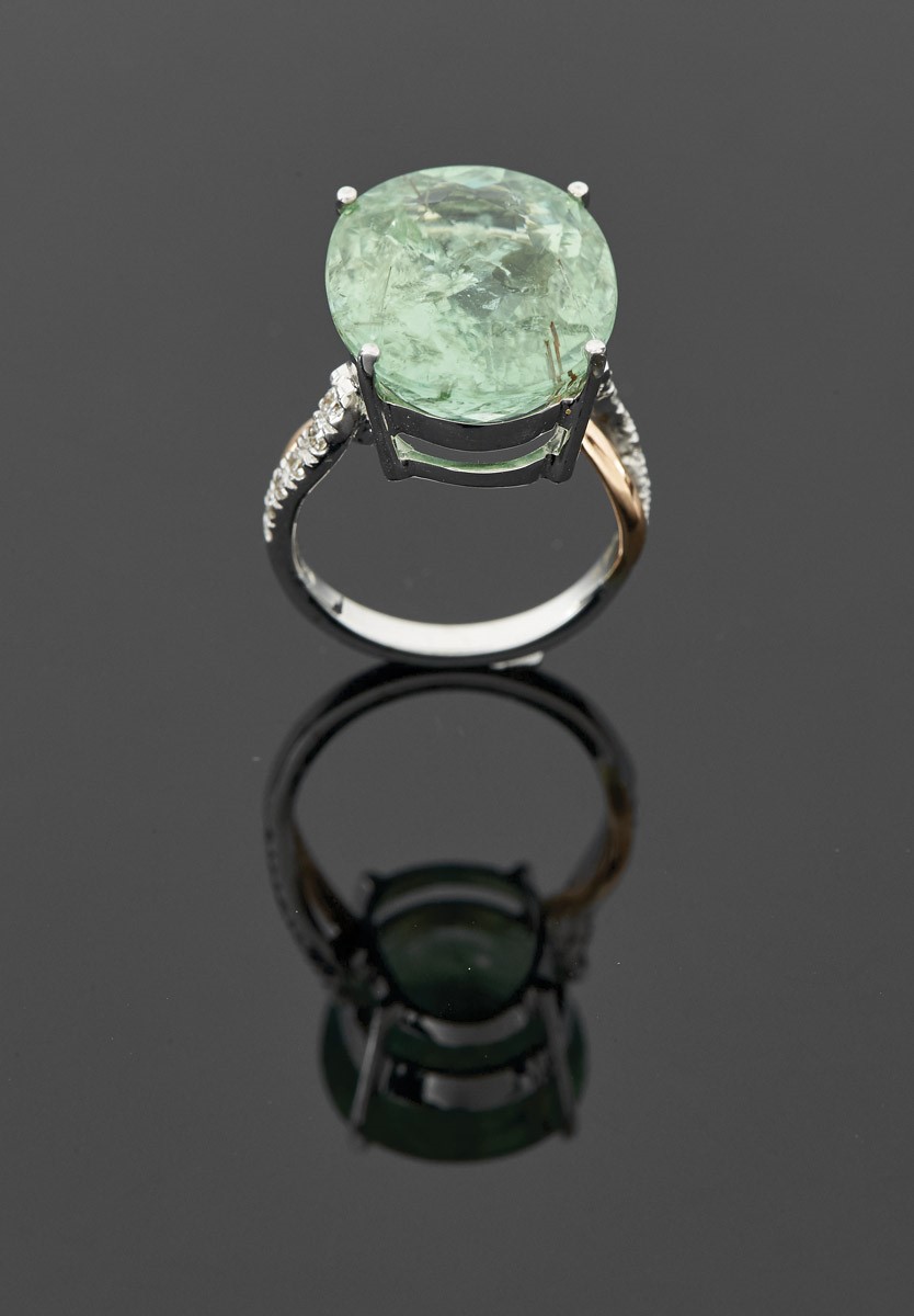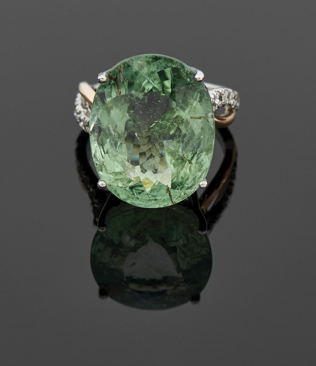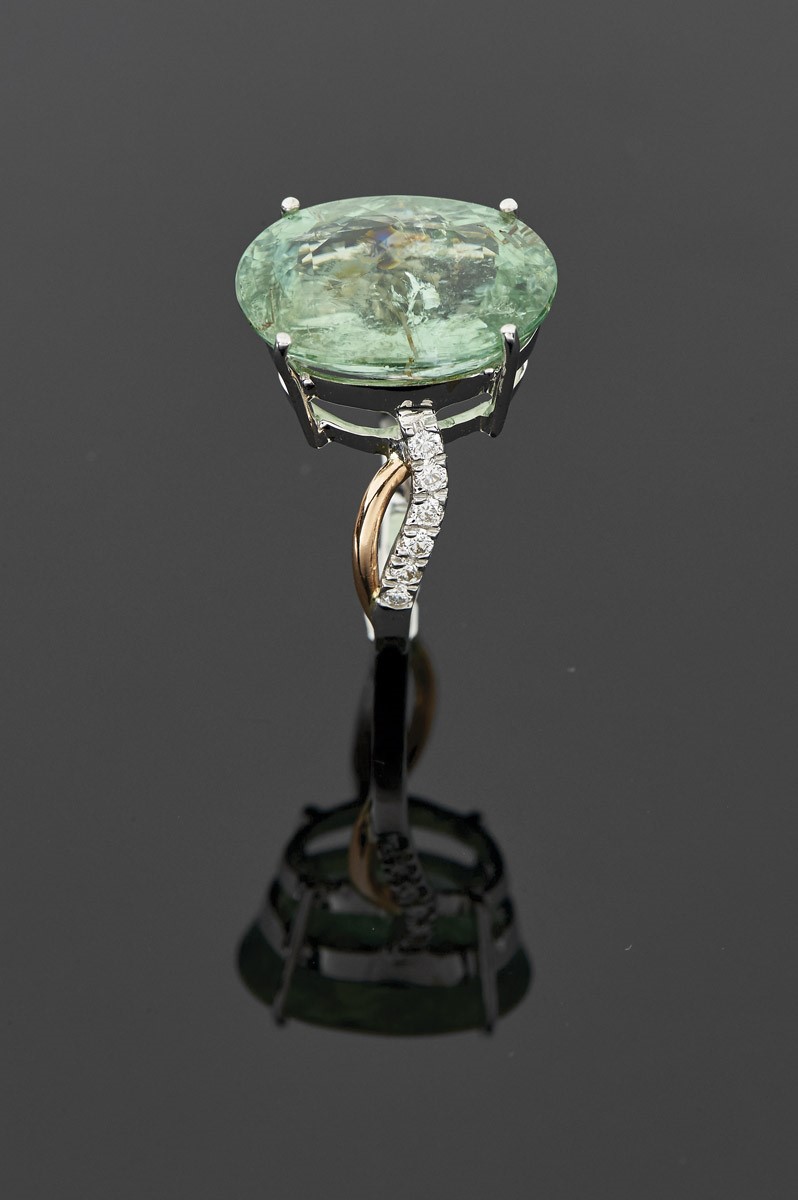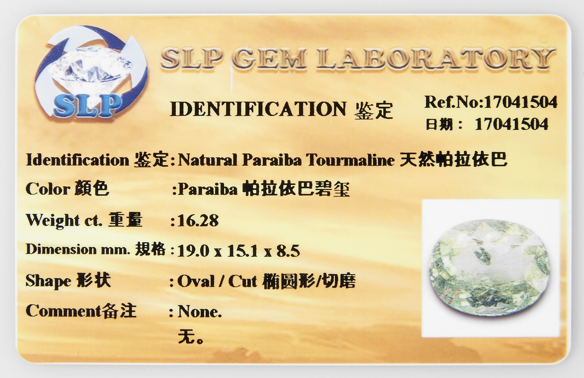 - cravejado com turmalina "Paraíba" verde em talhe oval com o peso aproximado de 16,28 ct. e 12 diamantes em talhe de brilhante com o peso aproximado de 0,32 ct.