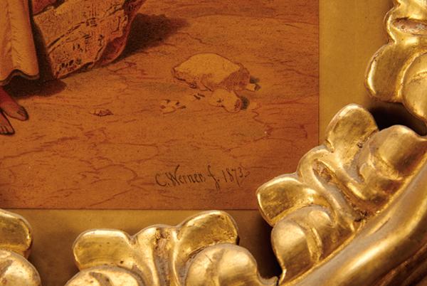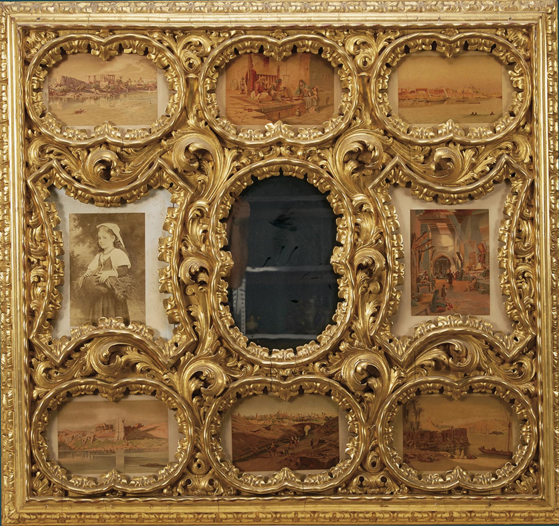 - a central com espelho, as restantes com estampas sobre papel: 15 de C. Werner (1808-1894) - "Vistas do Egipto", assinadas e datadas da década de 70 do séc. XIX; a outra de MANUEL DE MACEDO (1839-1915) - "Mendigo", assinada