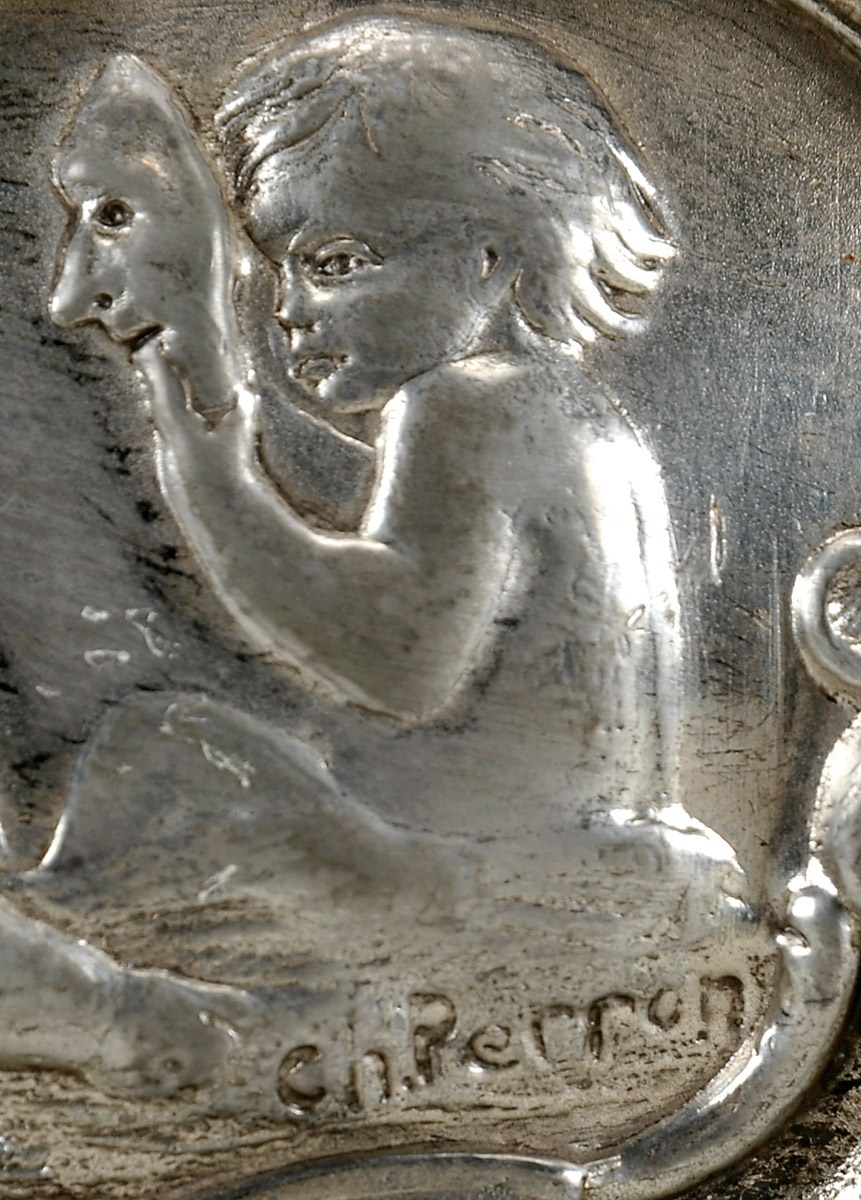 - A table Centerpiece,◙argenté bronze,◙relief decoration with sculptures "Boys",◙French, 19th C.,◙signed C.N. PERRON and V--S foundry mark