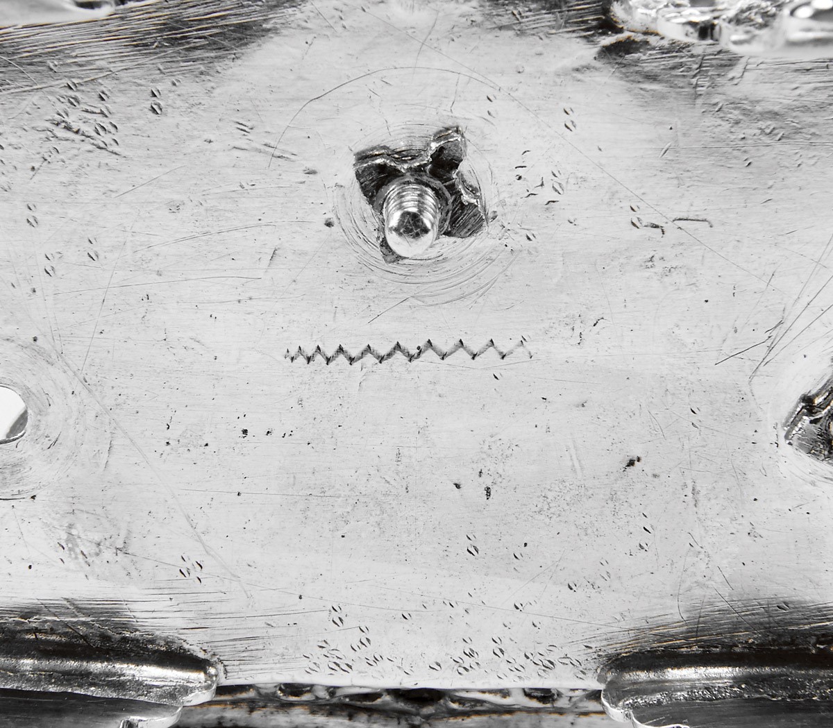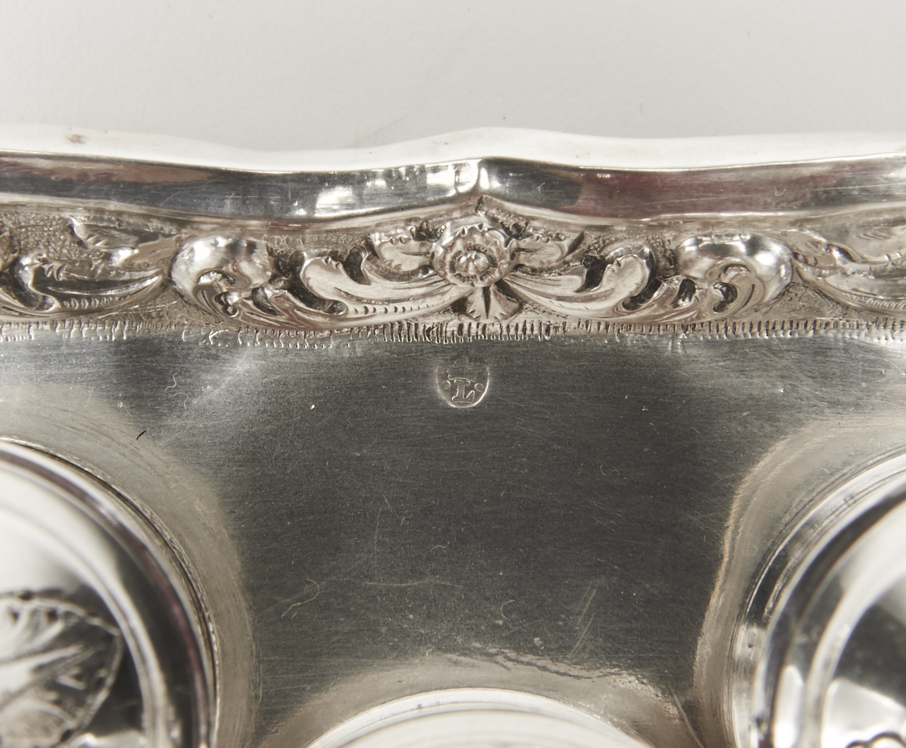 - decoração relevada e gravada "Flores", composta por 2 porta-penas, tinteiro, areeiro e campainha, marca de ensaiador de Lisboa (1843-1870), marca de ourives de Vitor Acto Diniz (1822-1879)
