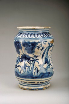 - exemplares semelhantes integram a colecção do Palácio Nacional de Mafra, com o nºs de inventário PNM 7217 e 7218.◙◙A pharmacy Jar,◙faience,◙blue decoration "Landscape with dogs and a rabbit near houses", listel with the inscription VNGto. AGGRIPE, Portugu