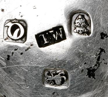 - decoração repuxada e espiralada "Volutas", marca da cidade de Londres (1771-1772), marca de ourives de Thomas Wallis I (1759-1777)