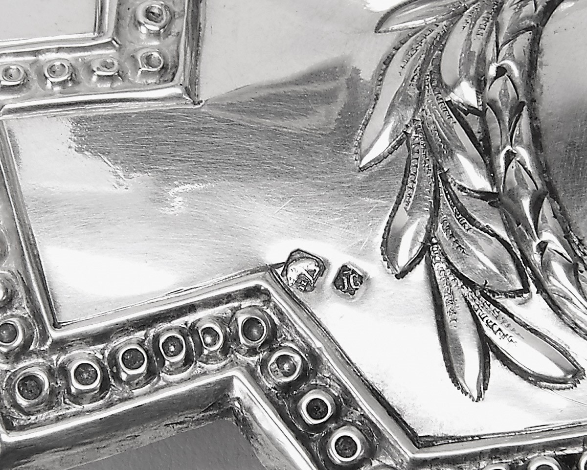 - decoração relevada "Cartelas ovais rodeadas por coroa de louros", contraste Javali do Porto (1887-1937), marca de ourives de José Ferreira Cardoso (1912-1956)