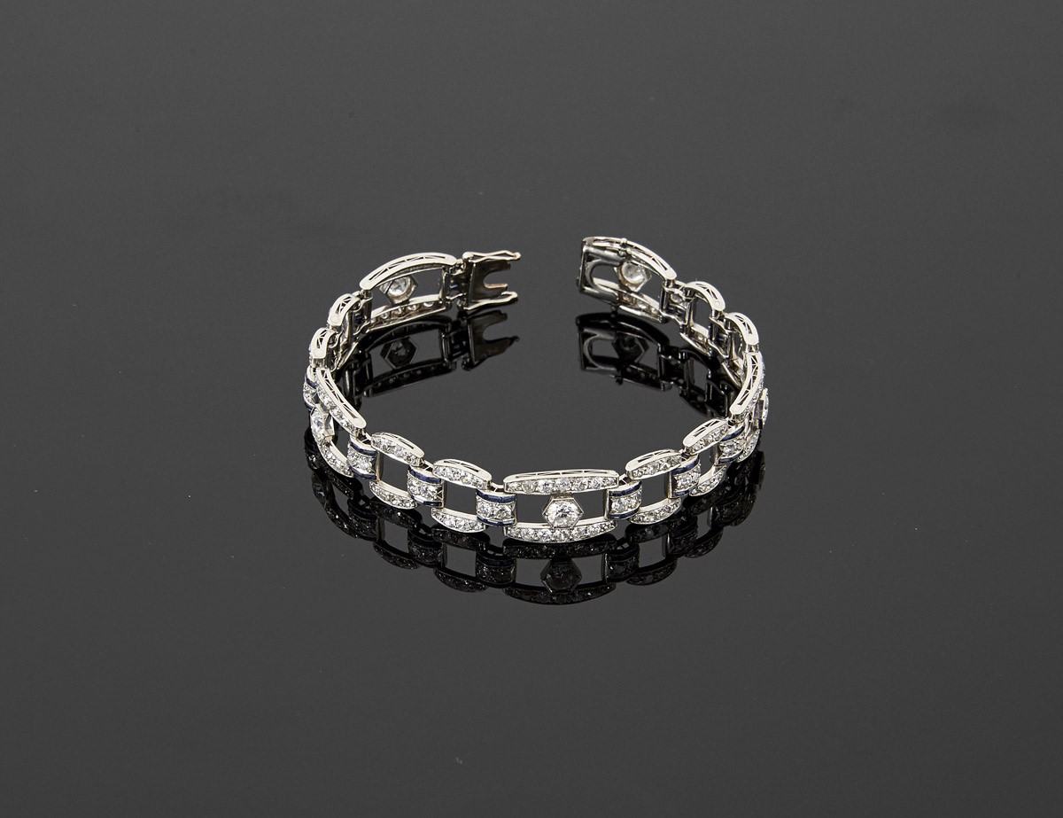 - cravejada com safiras calibradas e 165 diamantes em talhe de brilhante com o peso aproximade de 8,90 ct.
