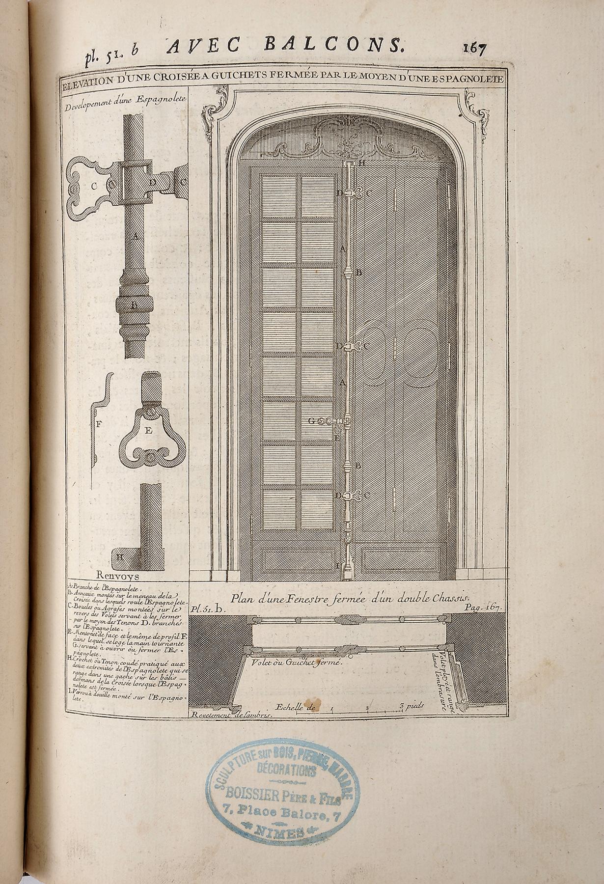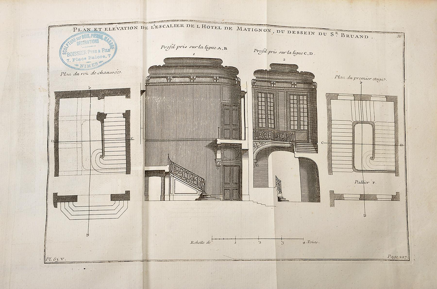 - VIGNOLA, Giacomo Barozzio da.- Cours d’architecture qui comprend les ordres de Vignole, avec de commentaires, les figursa & les descriptions de ses plus beaux bâtimens, & de ceux de Michel-Ange, des intructions et des preceptes... & généralement tout ce qui regarde l’art de bastir / par C. A. d’Aviler.- Nouvelle édition, enrichie de nouvelles planches... / par Pierre-Jean Mariette.- A Paris: Chez Pierre-Jean Mariette, 1750.- [4], XXXVIII, [10, 4], 408, [40] p.: il.; 29 cm.- E. Edição profusamente ilustrada a talhe-doce, mas de difícil colação, devido à diversidade das gravuras e respectiva numeração. Aparentemente encontra-se completo, não tendo sido registado qualquer hiato: gravuras em separado numeradas de 1 a 81 (a portada tem o nº 1); mais 3 gravuras com as letras A, B e C nas páginas preliminares; 97 gravuras de plena página, impressas junto ao texto. As gravuras 13 e 61 (em separado) encontram-se no final, antes da página 391. O total de gravuras é de 181, sendo 84 impressas junto ao texto e as restantes em separado a maioria desdobráveis. Exemplar com numerosos carimbos de empresa francesa de decoração (todas as gravuras estão carimbadas). Ligeiro manuseamento e acidez; mancha de água (ou gordura?) afectando as últimas 12 gravuras e 30 folhas finais. Sólida encadernação do século XX, inteira de carneira, sem qualquer gravação a ouro.