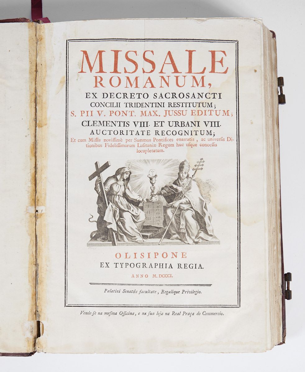 - MISSALE Romanum ex Decreto Sacrosancti Concilii Tridentini restitutum; S. Pii V. Pont. Max. jussu editum, Clementis VIII. primum, nunc denuo Urbani Papæ VIII. auctoritate recognitum...- Olisipone: In Typographia Regia, 1801.- [60], 624, CCLXXXI, 55 p.: il., notação musical; 29 cm.- E.