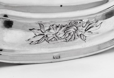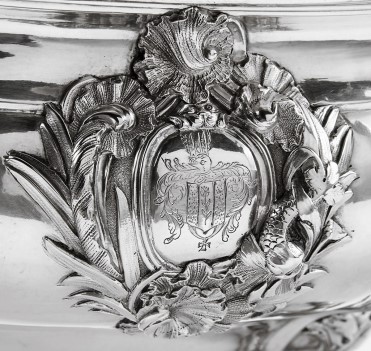 - decoração gomada, pomo da tampa "Ramo de flores", quatro «pés de garra e bola», pegas e moldura do escudo com "Concheados", armas com elmo, paquife e timbre não identificados, do escudo pende uma fita com uma cruz, marca de ourives IME possivelmente posterior à feitura da peça