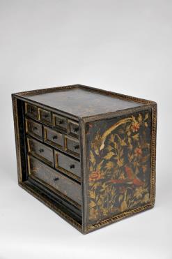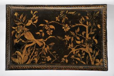 - decoração policromada e dourada "Pássaros e flores", interior das gavetas com pinturas