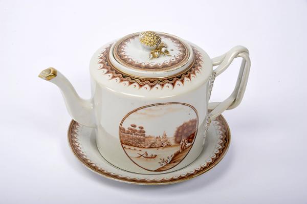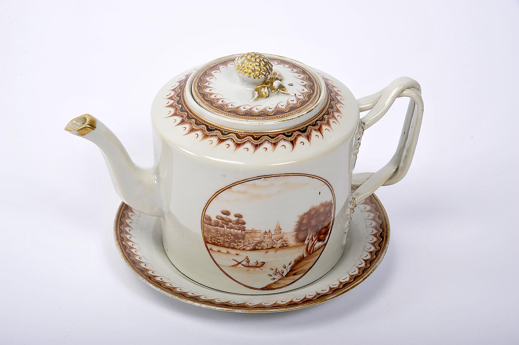 - decoração a sépia e dourado "Paisagem europeia com figuras", pomo da tampa relevado "Fruto"