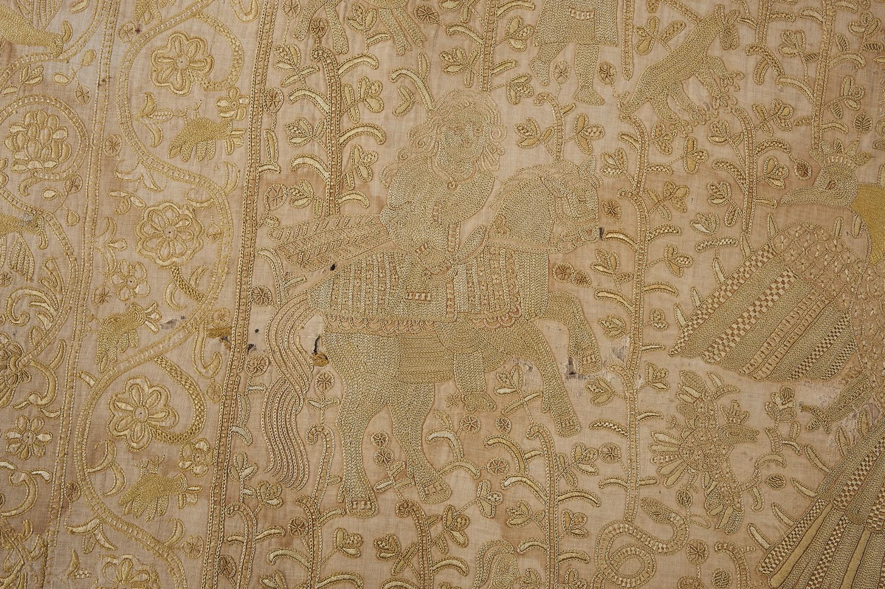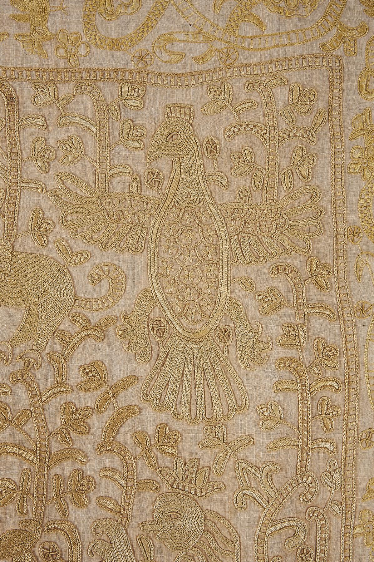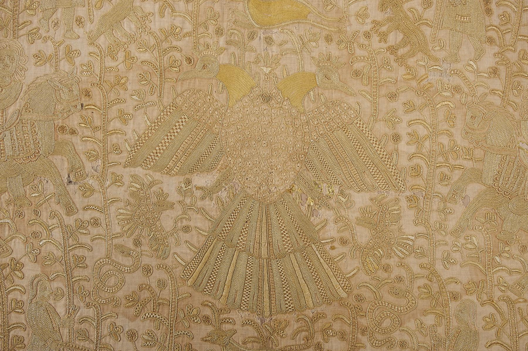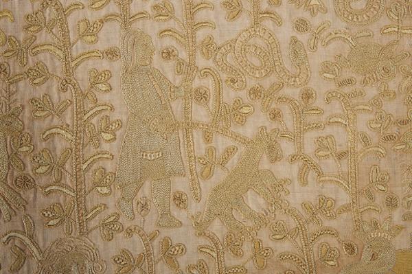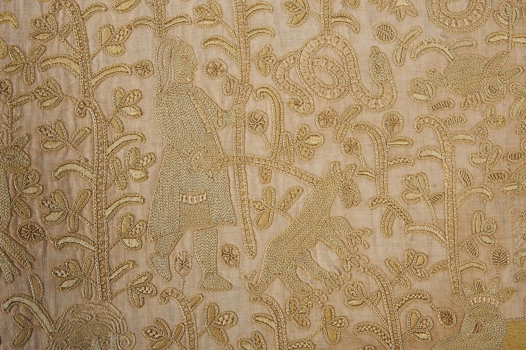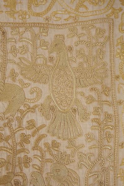 - linho bordado a fio de seda dourada "Cinco águias bicéfalas, dois portugueses a cavalo, quatro portugueses com cães pela trela, quatro águias, quatro leões coroados, duas Árvores da Vida, veados, pássaros e outros animais entre motivos vegetalistas"