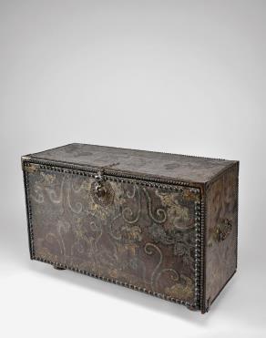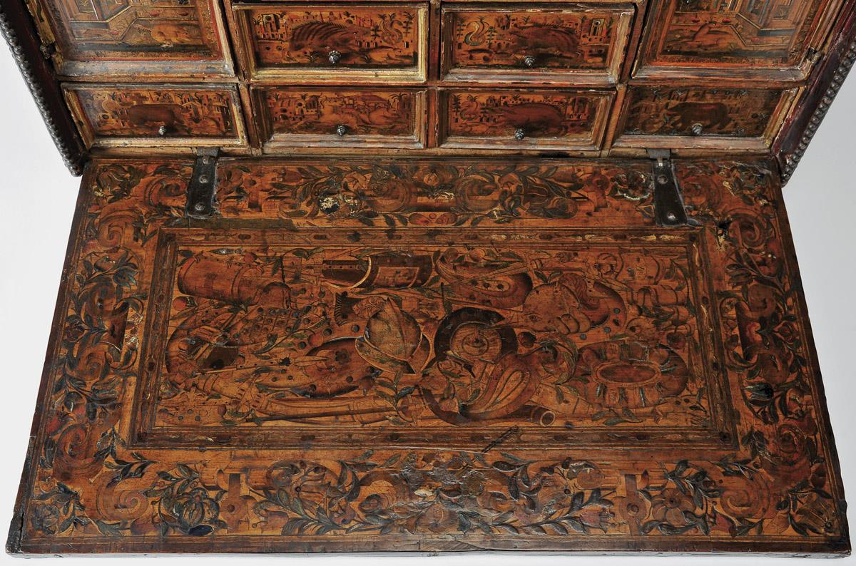 - interior com onze gavetas, simulando doze, e duas portas, frentes das gavetas e interior do tampo com decoração marchetada "Paisagens com animais" e "Troféus de batalha", ferragens em ferro com vestígios de dourado