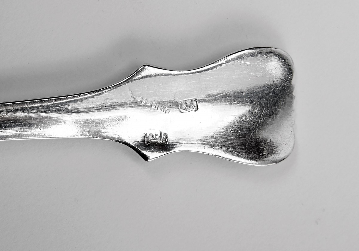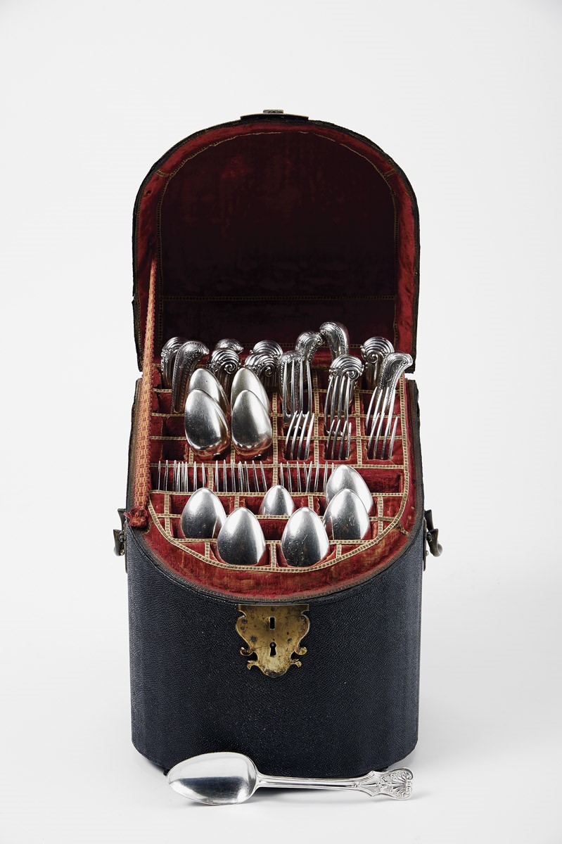 - interior com doze colheres de sopa e talheres de resto, marcas de ensaiador do Porto e de Évora (1803-1810), marcas de ourives de Custódio Martins Vilaça (1786-1836)