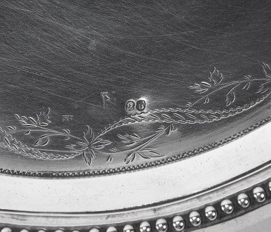 - decoração perlada e gravada "Grinaldas", marca de ensaiador do Porto (1803-1810), marca de ourives de José Pereira Ribeiro (1768-1806)