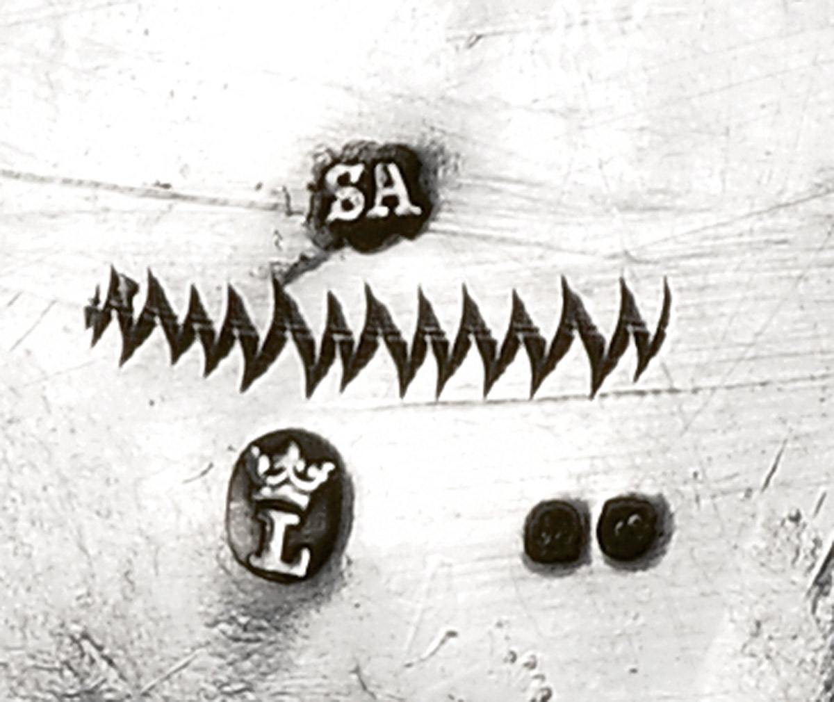 - pega em ébano, marca de ensaiador de Lisboa (1804-1810), marca de ourives de José Severino Antunes (1770-1822)