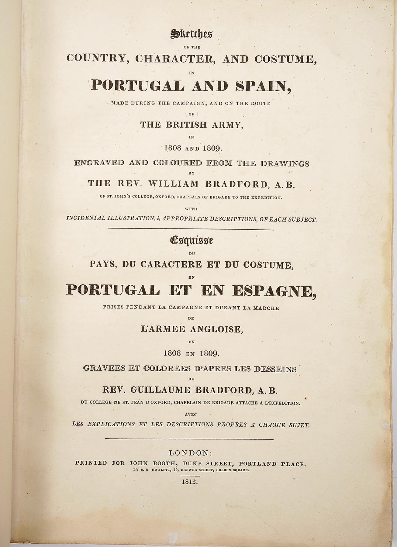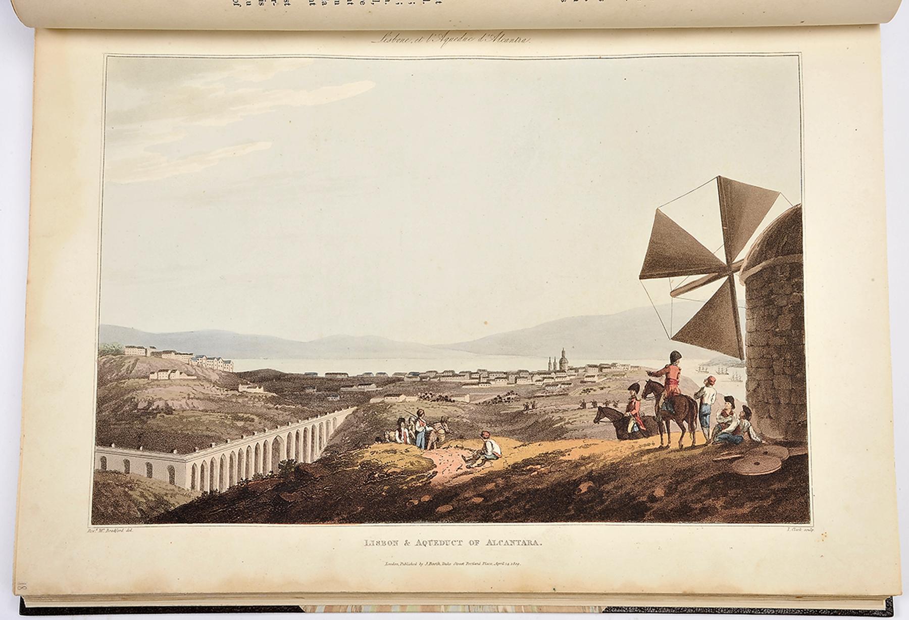 - Sketches of the country, character, and costume, in Portugal and Spain, made during the campaign, and on the route of the British Army, in 1808 and 1809 / engraved and coloured from the drawings by the Rev. William Bradford... = Esquisse du pays, du caractere et du costume, en Portugal et en Espagne, prises pendant la campagne et durant la marche de l’Armee Angloise, en 1808 en [sic] 1809. / Gravees et colorees d’apres les desseins du Rev. Guillaume Bradford...- London: John Booth, 1812.- London: printed for John Booth, 1812.- [38] f.: [39] gravuras coloridas; 37 cm.- E. Junto com: -----.- Revue historique et chronologique des evenements memorables de la Guerra dans la Peninsule [...] compilee et redigee pur servir de suplement aux esquisses du pays, costumes, &c. par Rev. Guillaume Bradford. = Chronological and historical restrospect of the memorable events of the War in the Peninsula [...] collected and anexed as a supplemental addition to the Rev. William Bradford’s views, &c.- London: printed for John Booth, 1813.- [2], 24 p.: [13] gravuras coloridas; 37 cm.- E. O reverendo William Bradford (1780-1857) foi capelão militar e acompanhou as forças de Wellington na campanha peninsular contra as tropas de Napoleão; os seus desenhos foram aperfeiçoados e gravados por J. Clark para ilustrar um dos mais belos livros sobre Portugal e Espanha publicados no século XIX. Variante da edição de 1810. A primeira parte contem 39 águas-tintas coloridas à mão, representando, sobretudo, trajos populares e vistas de cidades. A segunda inclui 13 águas-tintas coloridas, com uniformes militares portugueses, franceses e espanhóis (no exemplar estão aparentemente em falta as 10 páginas de texto, com rosto próprio, que antecedem as gravuras militares, mas que faltam em numerosos exemplares). O texto é bilingue em inglês e francês. As gravuras conferem exactamente com o índice. Meia-encadernação recente, em pele de búfalo, com estojo de protecção. Duarte de Sousa, 102. Tooley, 108.