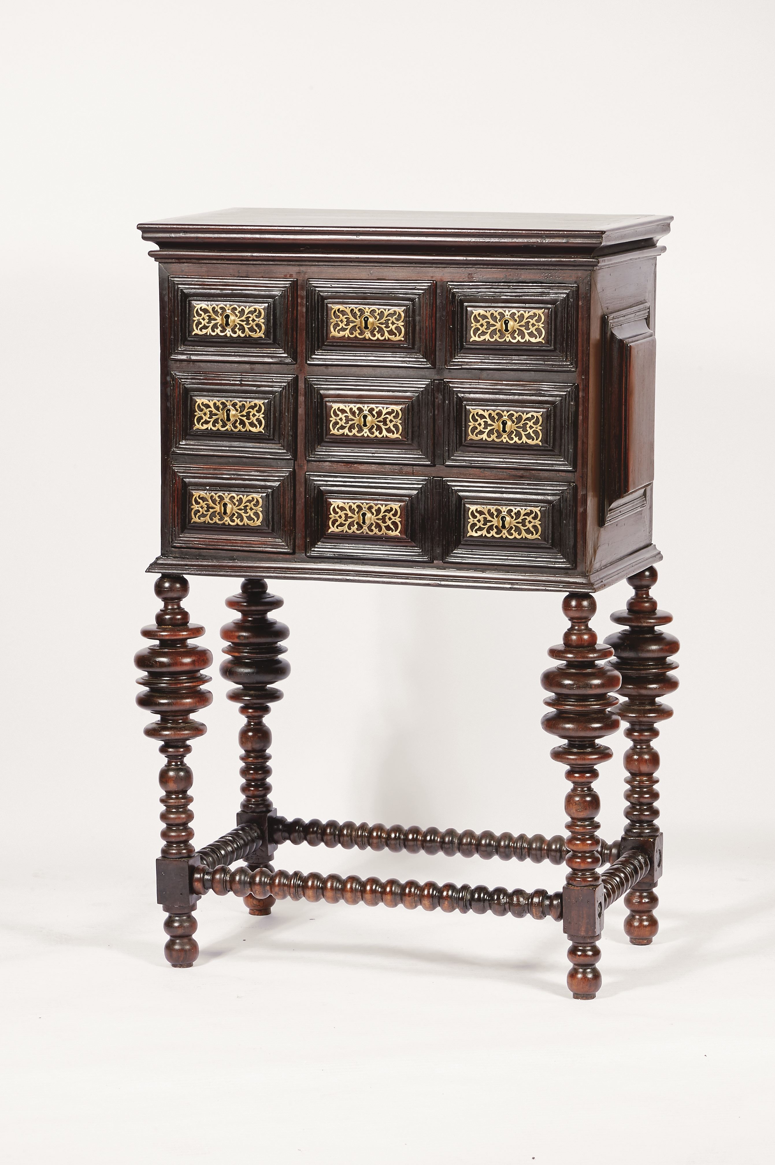 - frente das gavetas e laterais almofadados, trempe com pernas e travejamento torneados, ferragens em bronze
