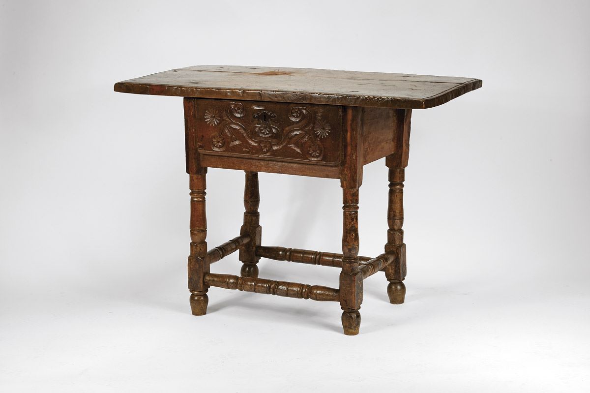 - gaveta com decoração de «goivados», pernas e travessas torneadas