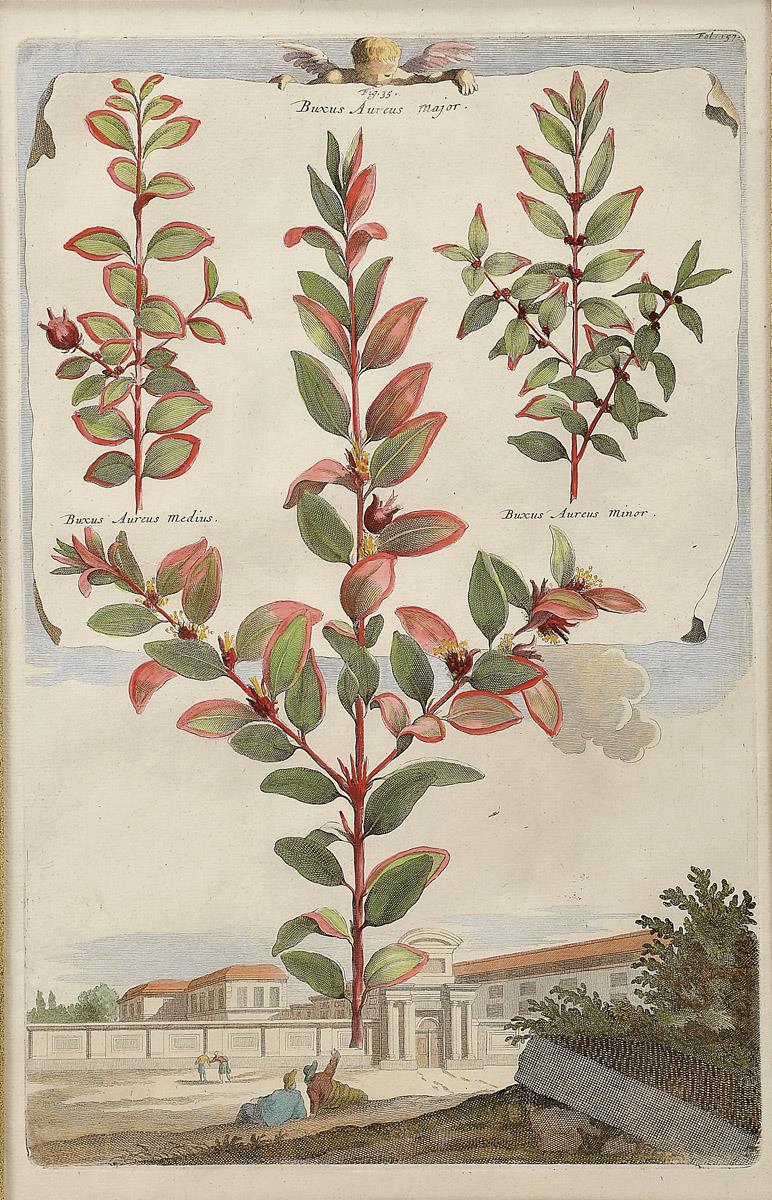 - as presentes gravuras foram produzidas para integrarem a obra: MINTING, Abraham (1626-1683) - Naauwkeurige Beschryving der Aardgewassen, Waar in de veelerley Aart en bijzondere Eigenschappen der Boomen, Heesters, Kruyden, Bloemen, Met haare Vrugten, Zaden, Wortelen en Bollen, Neevens derzelver waare Voort-Teeling, gelukkige Aanwinning, en heylzaame Genees-Krachten, Na een veel-jarige Oeffening en eigen Ondervinding, In drei onderscheide Boeken, naauwkeuriglijk beschreeven worden; Door der Heer", Utrecht and Leiden, Pieter vander Aa and Francois Halma, 1696