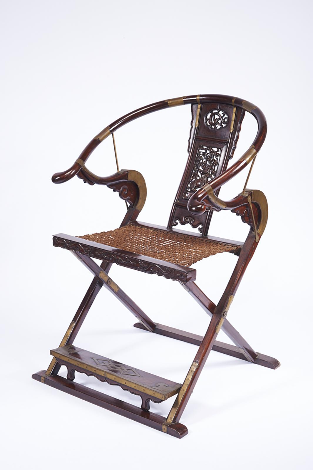 - tabela das costas vazada e entalhada, aplicações em metal, assento de corda