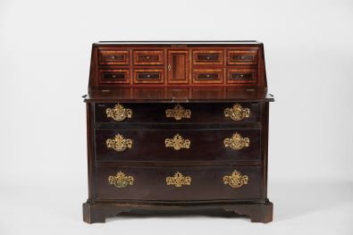 - interior com gavetas e porta, frente das gavetas do interior com marchetaria de pau-santo e pau-rosa com puxadores em metal, ferragens em metal amarelo