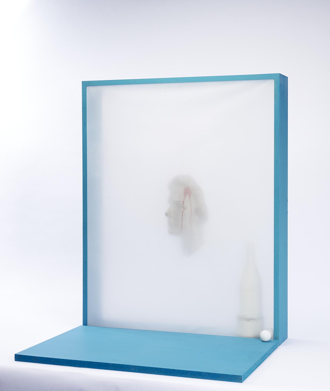 - aglomerado de madeira, garrafa de vidro e caixa de lata pintados a têmpera vinílica, filme plástico translúcido, cabeça de gesso com pintura a têmpera vinílica e bolas de ping-pong