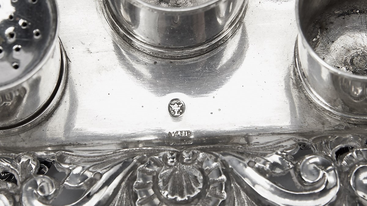 - decoração relevada e gravada "Flores", composta por 2 porta-penas, tinteiro, areeiro e campainha, marca de ensaiador de Lisboa (1870-1879), marca de ourives de Vitor Acto Diniz (1822-1879)