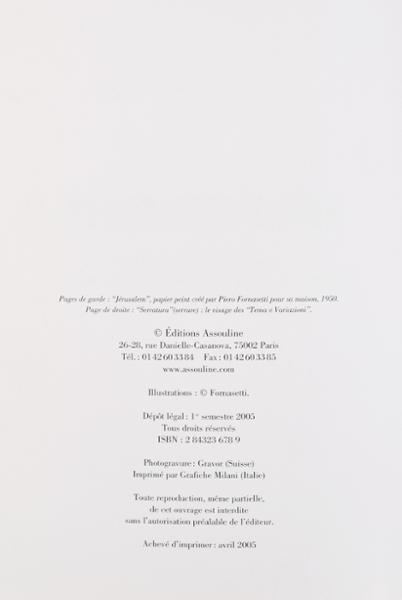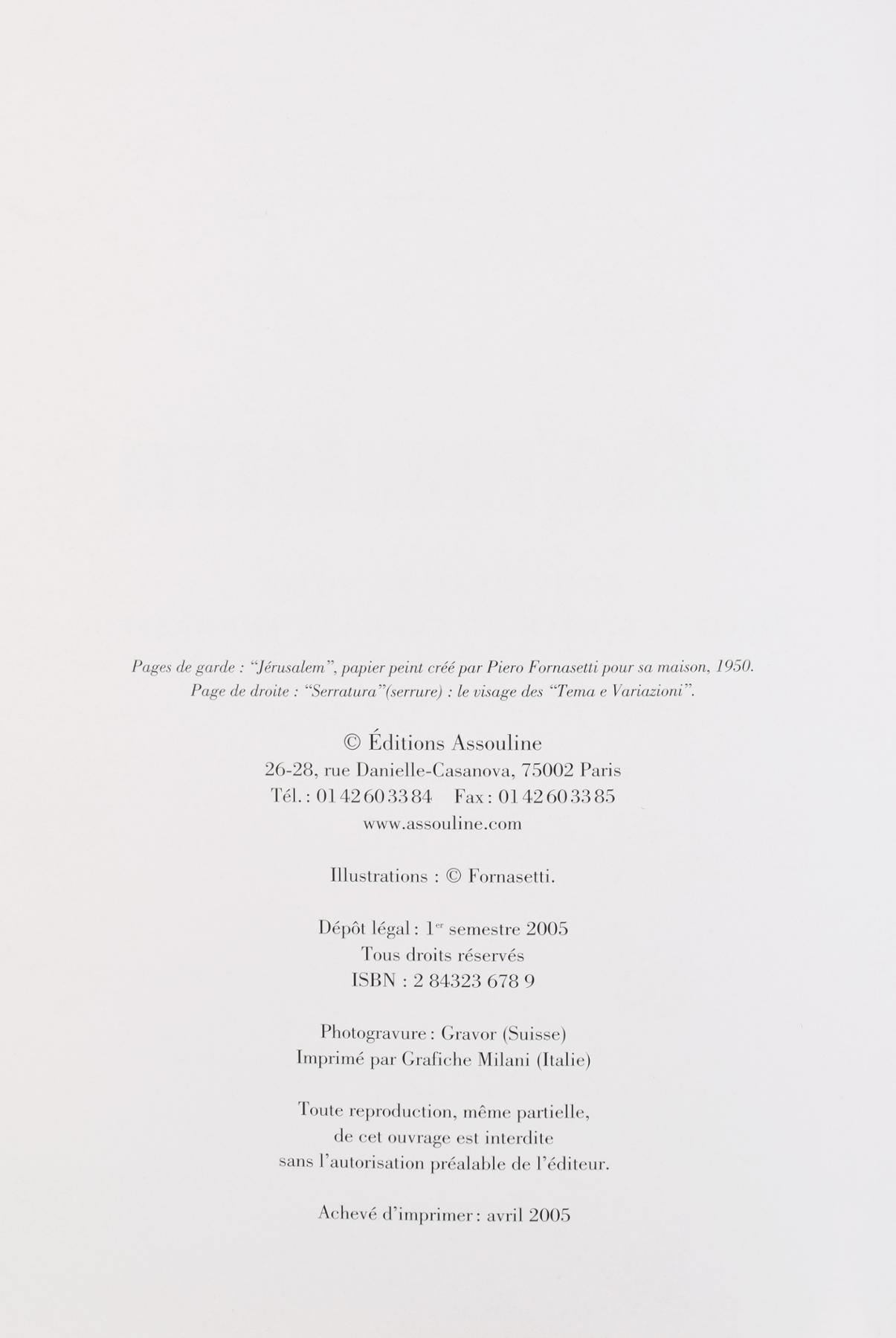 - FITOUSSI, Brigite.-Piero Fornasetti: Conversation avec Philippe Starck et Barnaba Fornasetti. Paris: Assouline, 2005, 1 volume. Ilustrado. Encadernado.