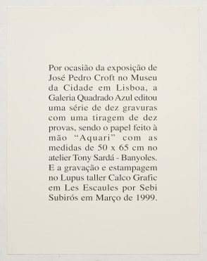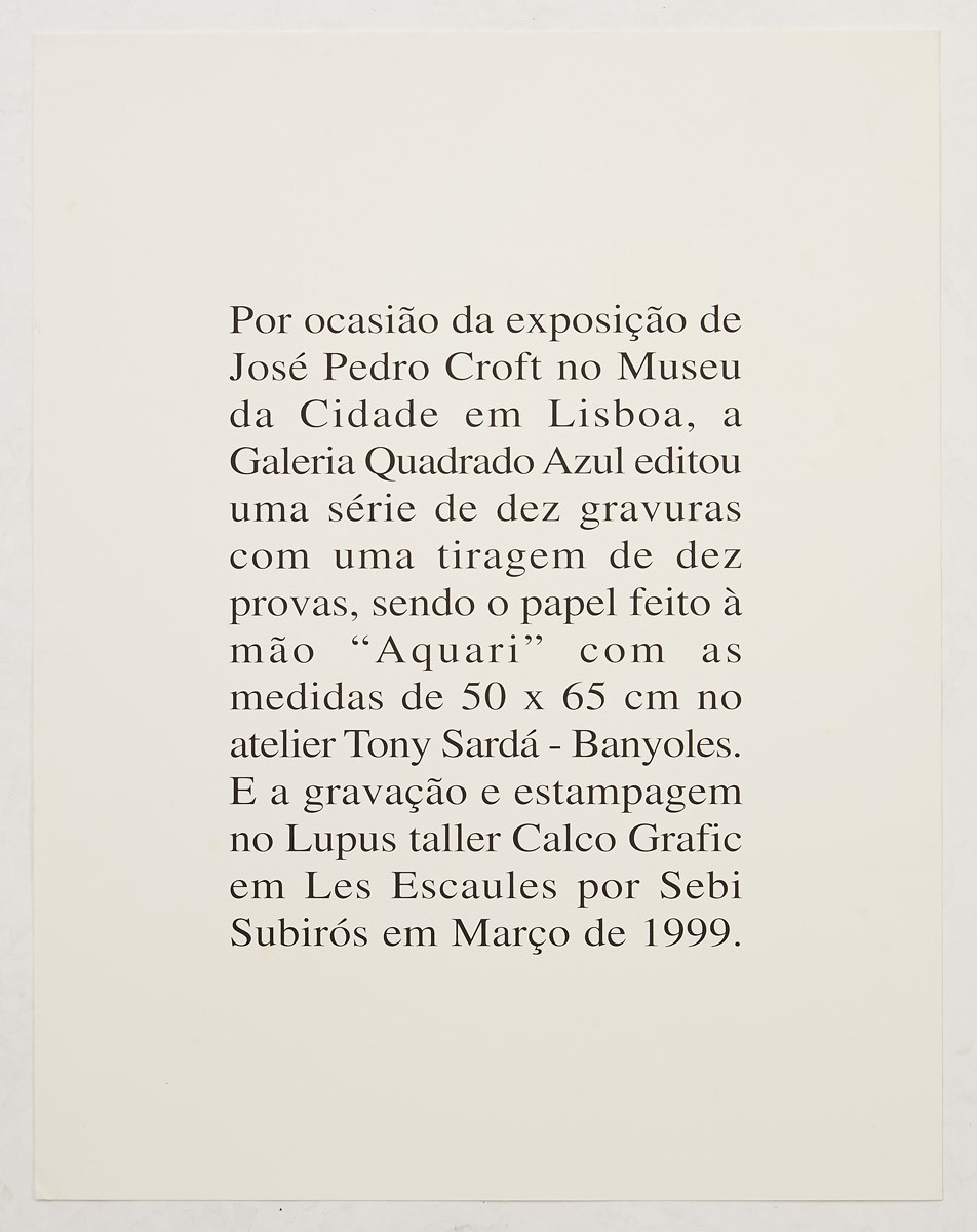 - exemplar nº 4 da série de 10 gravuras editada por ocasião da exposição individual do Autor "Desenho e Escultura de José Pedro Croft", realizada no Museu da Cidade, Lisboa, 1999.