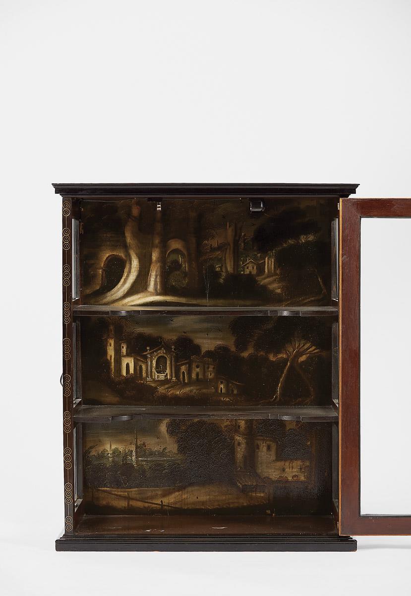 - frisos de ébano e tartaruga com embutidos de metal amarelo, interior com pinturas "Paisagens com construções", ferragens em ferro dourado