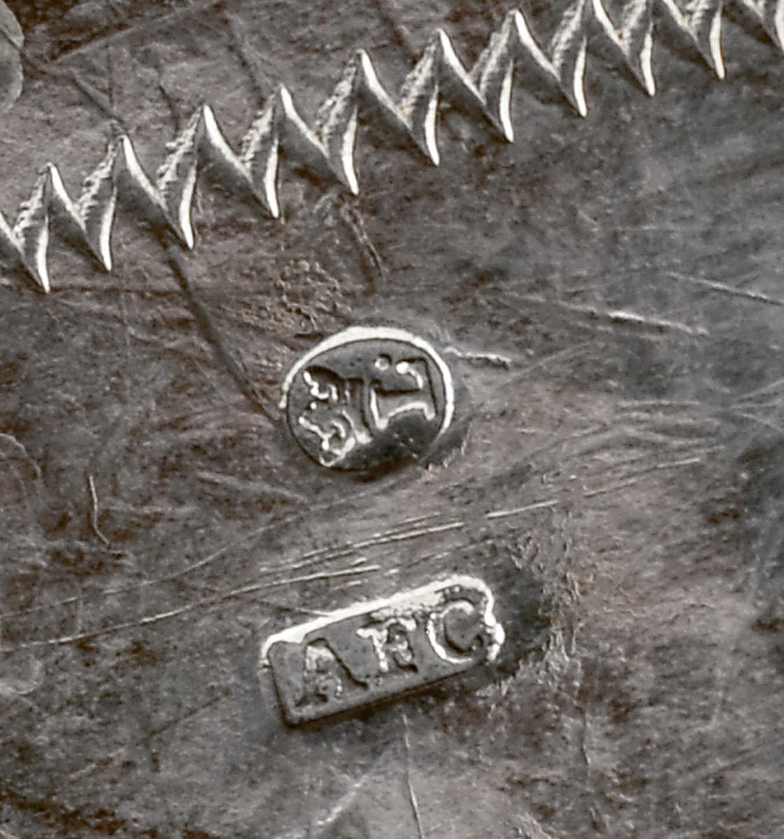 - decoração gravada "Gregas", marca de ensaiador de Lisboa (1822-1843), marca de ourives de António Firmo da Costa (1793-1824)